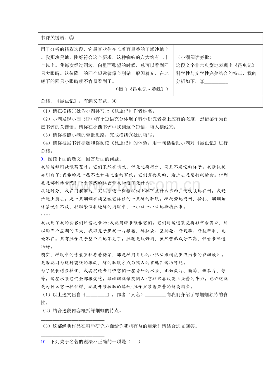 9.昆虫记 法布尔 ①从不屑吃莴苣叶,喜吃活食可以看出绿蝈蝈食肉的习性;②从捕捉蝉的情景可以看出绿蝈蝈生性残忍。 示例.①善于观察,细致观察,反复观察;②善于思考;③记录实事求是,尊重事实;④敢于怀疑并不断求证。