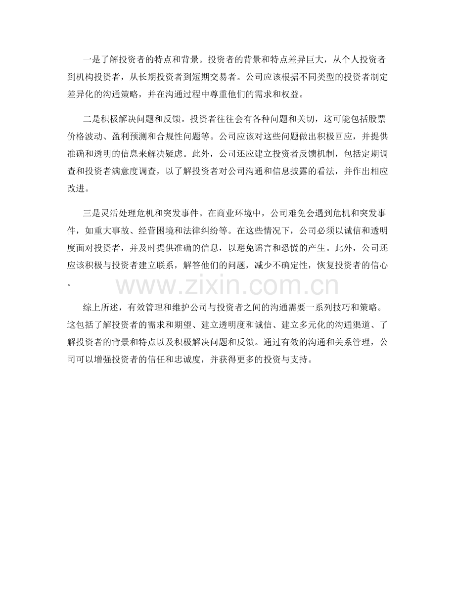 综上所述,有效管理和维护公司与投资者之间的沟通需要一系列技巧和策略。这包括了解投资者的需求和期望、建立透明度和诚信、建立多元化的沟通渠道、了解投资者的背景和特点以及积极解决问题和反馈。通过有效的沟通和关系管理,公司可以增强投资者的信任和忠诚度,并获得更多的投资与支持。