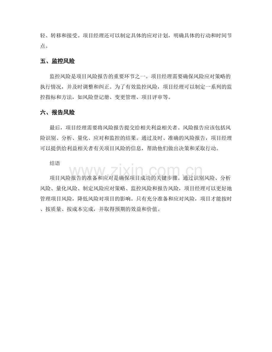 项目风险报告的准备和应对是确保项目成功的关键步骤。通过识别风险、分析风险、量化风险、制定风险应对策略、监控风险和报告风险,项目经理可以更好地管理项目风险,降低风险对项目的影响。只有充分准备和应对风险,项目才能按时、按质量、按成本完成,并取得预期的效益和价值。