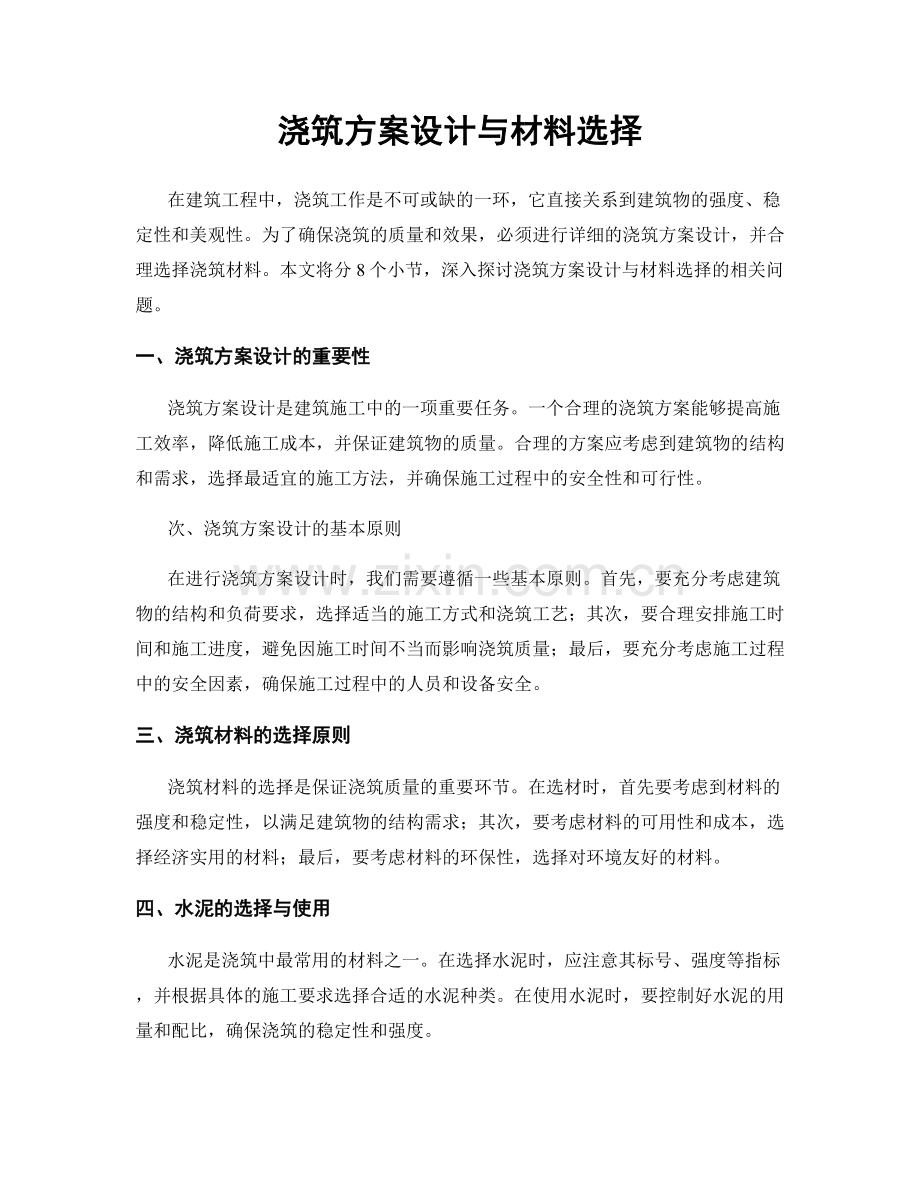 综上所述,浇筑方案设计和材料选择是建筑工程中至关重要的一环。通过合理的方案设计和材料选择,能够保证浇筑工作的质量和效果,提高建筑物的强度和稳定性,从而确保建筑物的长期使用和安全。因此,建筑施工中应高度重视浇筑方案设计和材料选择的工作,确保施工质量和效益的提高。