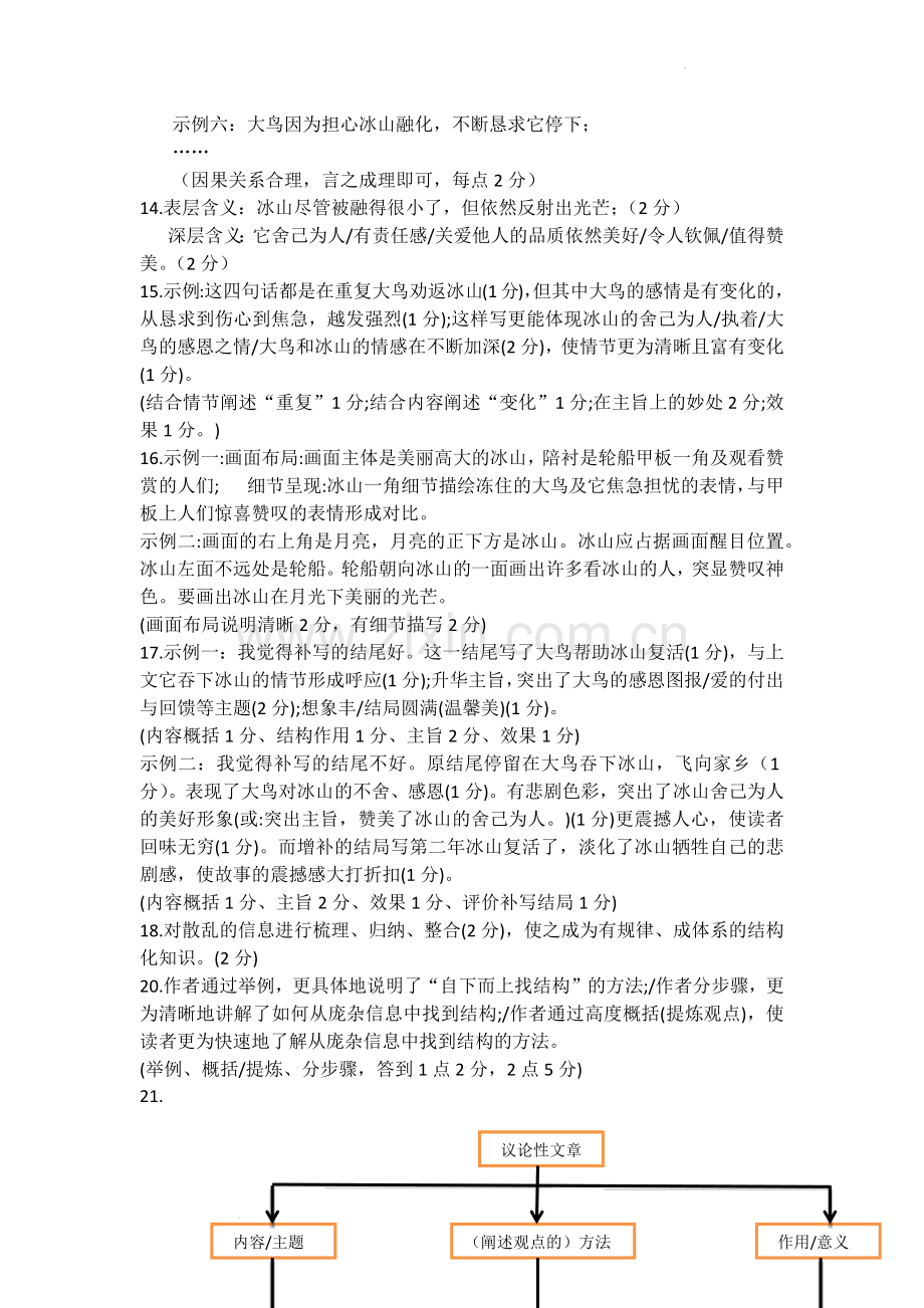 17.示例一:我觉得补写的结尾好。这一结尾写了大鸟帮助冰山复活(1分),与上文它吞下冰山的情节形成呼应(1分);升华主旨,突出了大鸟的感恩图报/爱的付出与回馈等主题(2分);想象丰/结局圆满(温馨美)(1分)。