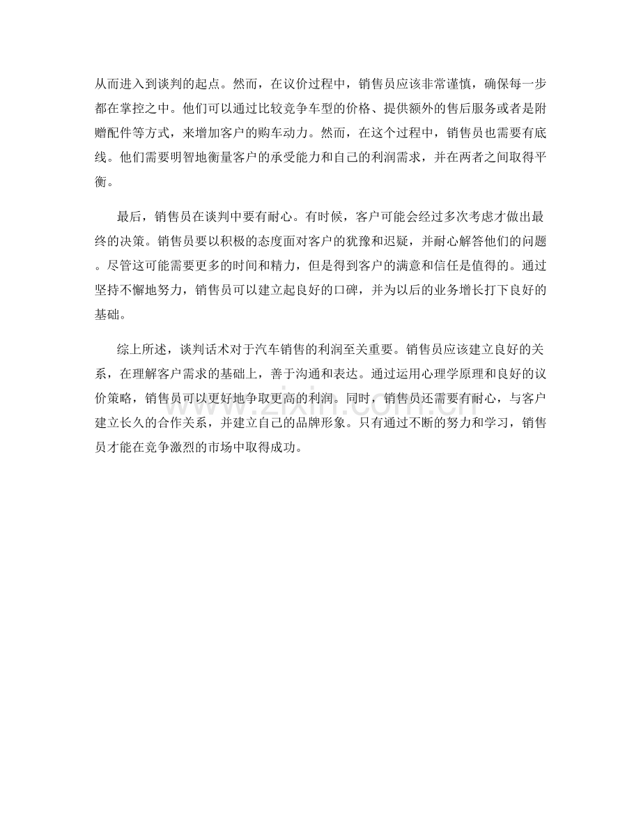 综上所述,谈判话术对于汽车销售的利润至关重要。销售员应该建立良好的关系,在理解客户需求的基础上,善于沟通和表达。通过运用心理学原理和良好的议价策略,销售员可以更好地争取更高的利润。同时,销售员还需要有耐心,与客户建立长久的合作关系,并建立自己的品牌形象。只有通过不断的努力和学习,销售员才能在竞争激烈的市场中取得成功。