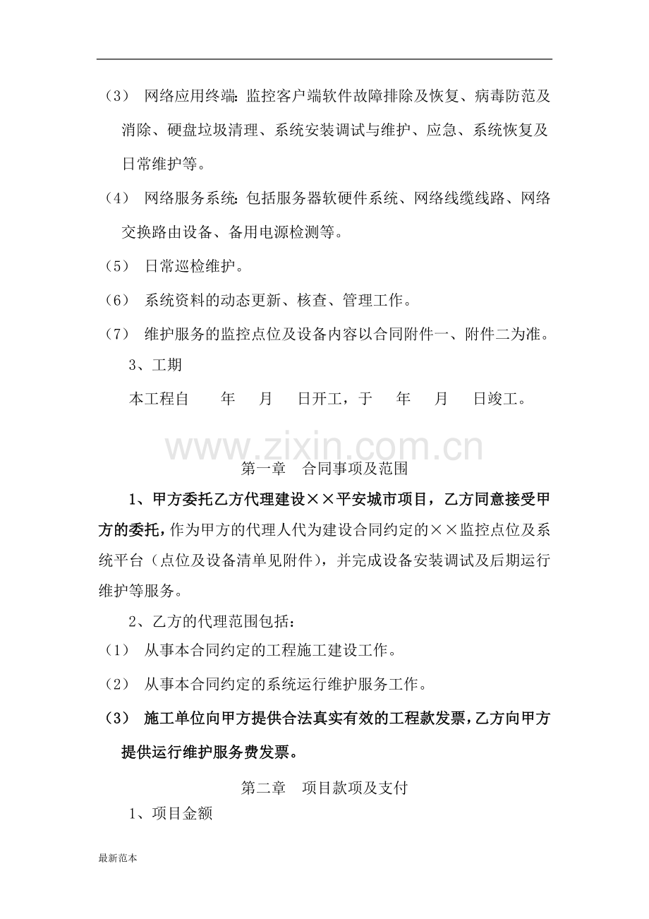 1、甲方委托乙方代理建设××平安城市项目,乙方同意接受甲方的委托,作为甲方的代理人代为建设合同约定的××监控点位及系统平台(点位及设备清单见附件),并完成设备安装调试及后期运行维护等服务。