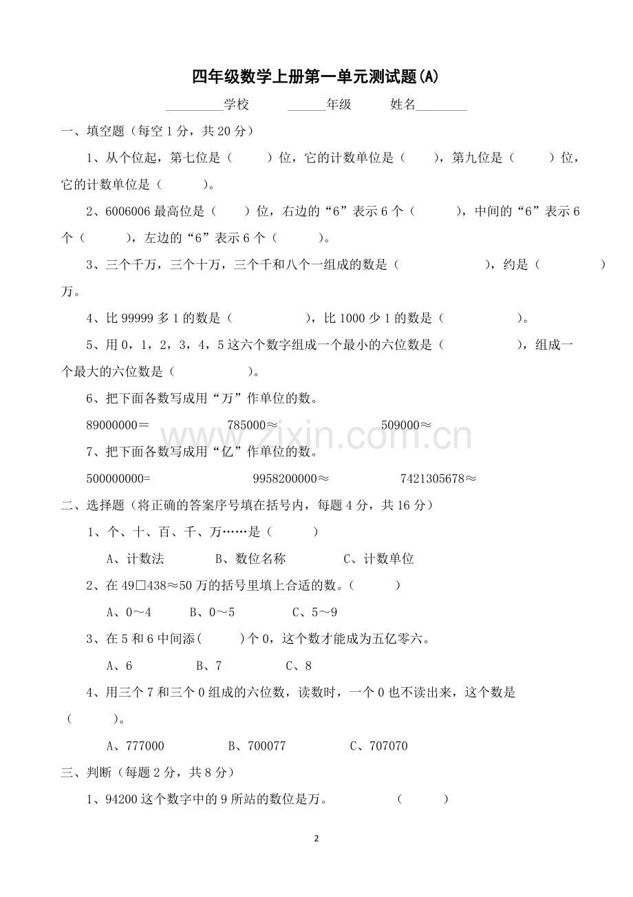 3、整数的计划单位只有:个、十、百、千、万、十万、百万、千万。 ( )