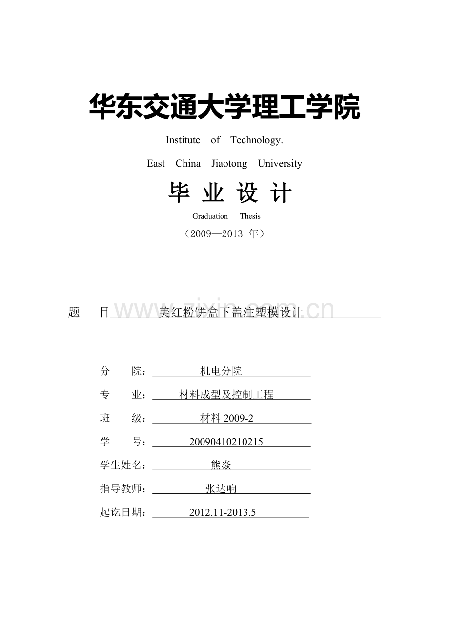 通过这次玫红粉饼盒下盖的毕业设计,让我边学边做,把大学四年拉下的知识全都学了一遍,在毕业设计以前我还有很多知识没学到,并且没有自己动手设计的能力。在这次毕业设计中,我开始无从入手,然后我把和设计有关的书都翻了一边,整天上网查设计方面的资料,慢慢的我设计中学会了很多知识,并且让我将理论知识和实践设计联系在一起,同时也拥有了动手能力和创新能力,更让知识得到全面的巩固,让我对塑料制品的设计和成型有了全新的了解,具备初步的塑料制品的设计能力。