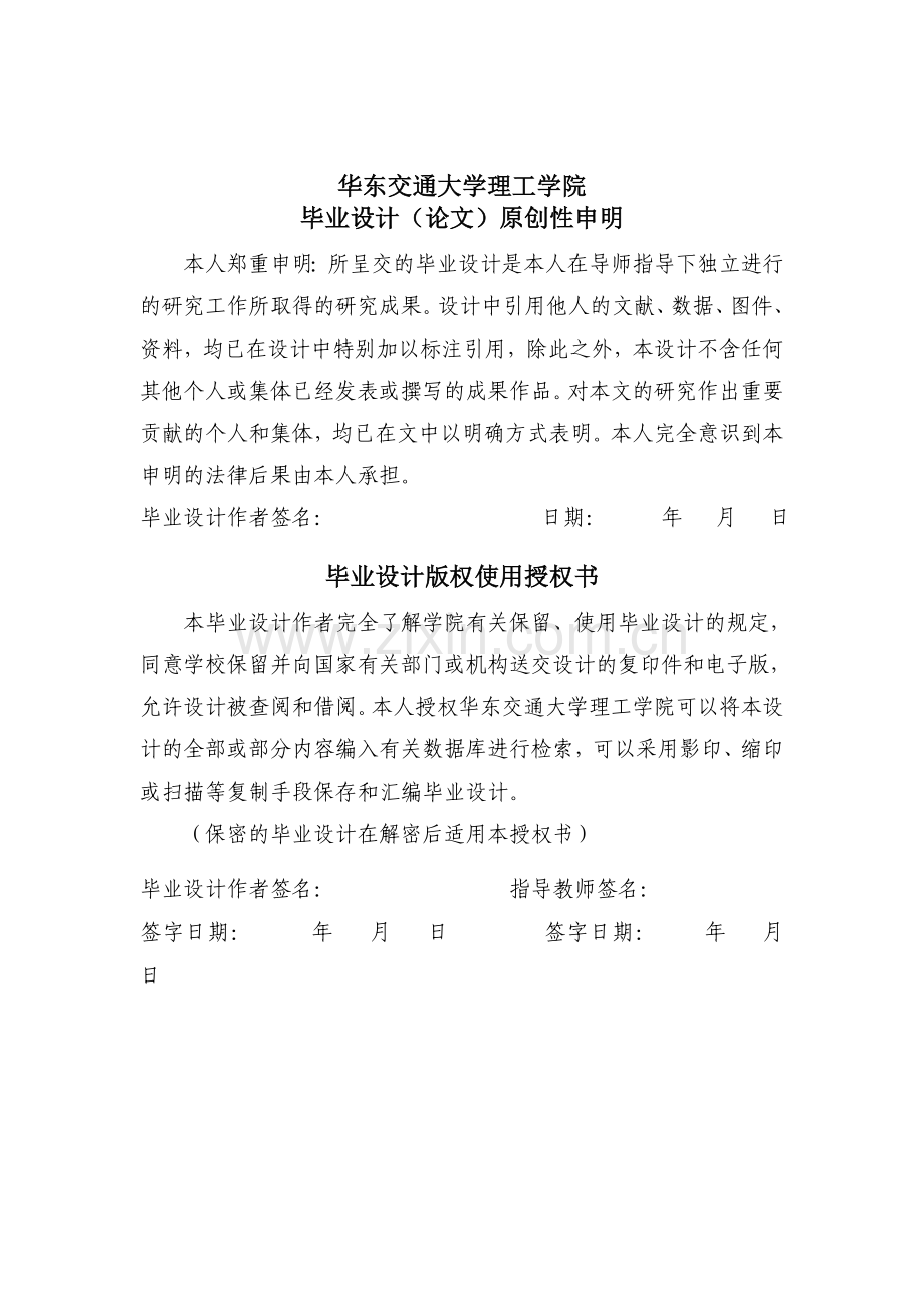 本毕业设计作者完全了解学院有关保留、使用毕业设计的规定,同意学校保留并向国家有关部门或机构送交设计的复印件和电子版,允许设计被查阅和借阅。本人授权华东交通大学理工学院可以将本设计的全部或部分内容编入有关数据库进行检索,可以采用影印、缩印或扫描等复制手段保存和汇编毕业设计。