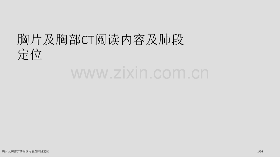 胸片及胸部CT阅读内容及肺段定位胸片及胸部CT的阅读内容及肺段定位1/26一张胸片或者CT应该包含解剖结构:一、胸廓 1、胸壁软组织 胸廓肌群(胸大肌、胸小肌、肩带肌、脊柱伸肌群、后胸壁肌群、胸锁乳突肌、肋间肌、背阔肌、大圆肌等)、乳房及其脂肪等。2、骨性胸廓 由肋骨、胸骨、胸椎、肩胛骨和锁骨组成。3、胸膜 衬于胸壁内面称为壁层胸膜;衬于肺表面称为脏层胸膜;两层胸膜之间腔隙称为胸腔。正正 常常 X 胸胸 片片胸片及胸部CT的阅读内容及肺段定位2/26一张胸片或者CT应该包含解剖结构:二、气管、支气管气管:起于环状软骨下缘,止于隆突,长约11-13CM。隆突:气管分叉下壁形成突起,相当于5-6胸椎平面。支气管:1、气管在隆突层面分为左右主支气管2、右主支气管及往下分为上中下三支肺叶支气管,往下分为十个肺段支气管3、左主支气管往下分为上下肺叶支气管,继之分为八个肺段支气管。胸片及胸部CT的阅读内容及肺段定位3/26一张胸片或者CT应该包含解剖结构:三、肺肺段:由单独支气管和血管供给肺组织,肺段之间无胸膜分割。肺叶:由25个肺段组成,脏层胸膜包裹分割开相对独立肺组织。所以依据支气管和血管供给解剖不一样,左右肺结构不一样,右肺分为三叶十个肺段,左肺分为两叶八个肺段。胸片及胸部CT的阅读内容及肺段定位4/26一张胸片或者CT应该包含解剖结构:三、纵膈位于胸骨之后,胸椎之前,两肺之间,上为胸廓入口,下为横膈。包含心脏、大血管、气管、食管、主支气管、淋巴组织、胸腺、神经及脂肪等。胸片及胸部CT的阅读内容及肺段定位5/26一张胸片或者CT应该包含解剖结构:纵隔胸片六分区法:在侧位片上,从胸骨柄体交界处至第4胸椎下缘画一水平线,其上为上纵隔,下为下纵隔。以气管、升主动脉及心脏前缘连线作为前、中纵隔分界,在以食道前壁及心脏后缘连线作为中、后纵隔得分界。分为前、中、后三区,共六区。胸片及胸部CT的阅读内容及肺段定位6/26一张胸片或者CT应该包含解剖结构:四、横膈 为分隔胸、腹腔腱性隔膜,由中心腱和周围肌性部分组成。右侧膈顶较左侧高1-2cm,普通相当于第六前肋间隙水平。胸片及胸部CT的阅读内容及肺段定位7/26阅读胸片和胸部CT内容次序依据解剖结构:胸廓气管肺纵膈横膈胸片及胸部CT的阅读内容及肺段定位8/26肺段:胸片及胸部CT的阅读内容及肺段定位9/26肺段位置胸片正常右正常右侧侧位胸片位胸片胸片及胸部CT的阅读内容及肺段定位10/26肺段位置胸片正常左正常左侧侧位胸片位胸片胸片及胸部CT的阅读内容及肺段定位11/26肺段位置判定胸部CT胸片及胸部CT的阅读内容及肺段定位12/26肺段位置判定胸部CT胸片及胸部CT的阅读内容及肺段定位13/26肺段位置判定胸部CT胸片及胸部CT的阅读内容及肺段定位14/26肺段位置判定胸部CT胸片及胸部CT的阅读内容及肺段定位15/26肺段位置判定胸部CT胸片及胸部CT的阅读内容及肺段定位16/26肺段位置判定胸部CT胸片及胸部CT的阅读内容及肺段定位17/26肺段位置判定胸部CT胸片及胸部CT的阅读内容及肺段定位18/26胸部CT肺段位置记忆口诀:独眼能看双上肺,左下还留一点背。对眼能看前后背,双眼能看前和背。嵴角出现能看中舌背,基底干出现看中舌余下肺。胸片及胸部CT的阅读内容及肺段定位19/26独眼能看双上肺,左下还留一点背胸片及胸部CT的阅读内容及肺段定位20/26独眼能看双上肺,左下还留一点背胸片及胸部CT的阅读内容及肺段定位21/26对眼能看前后背,双眼能看前和背胸片及胸部CT的阅读内容及肺段定位22/26对眼能看前后背,双眼能看前和背胸片及胸部CT的阅读内容及肺段定位23/26嵴角出现能看中舌背,基底干出现看中舌余下肺(嵴角:嵴角指有中叶支气管与下叶支气管夹角,内有右上肺静脉断面)胸片及胸部CT的阅读内容及肺段定位24/26嵴角出现能看中舌背,基底干出现看中舌余下肺胸片及胸部CT的阅读内容及肺段定位25/26 谢谢观赏胸片及胸部CT的阅读内容及肺段定位26/26