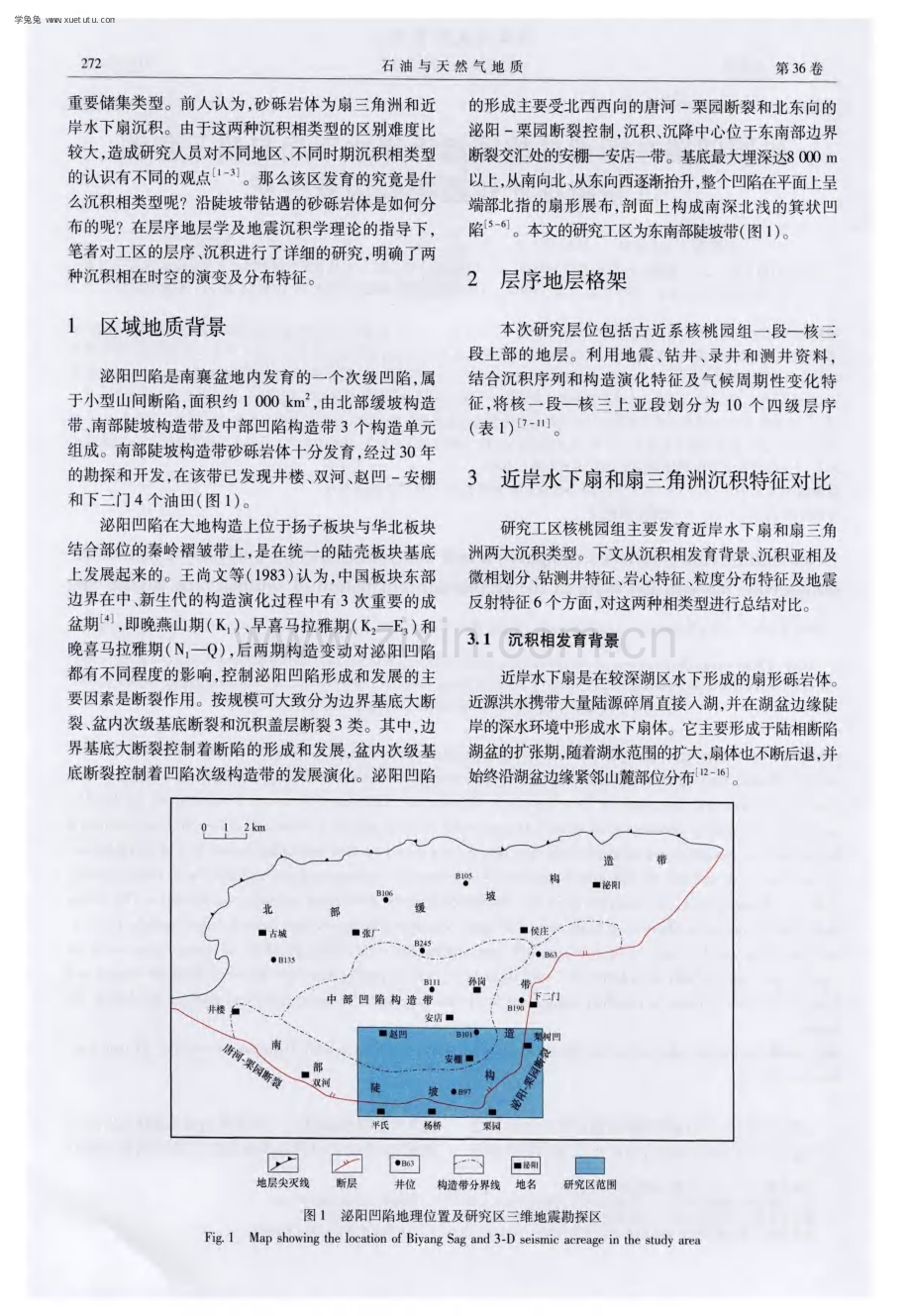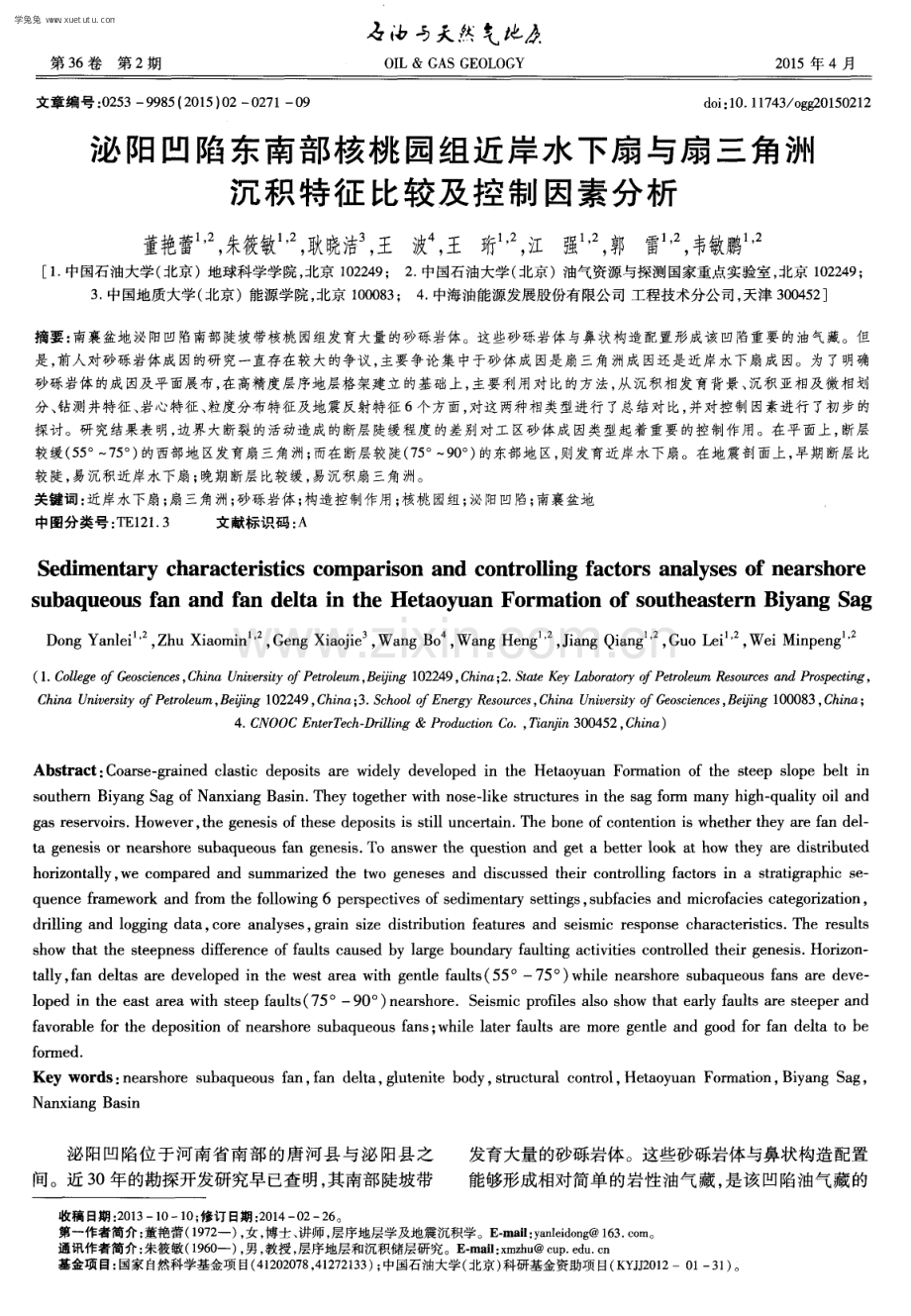 第 3 6卷第 2期 -5 天然乞肥 0 I L&G A S G E O L 0 G Y 2 0 1 5年 4月 文章编号 : 0 2 5 3 9 9 8 5 ( 2 0 1 5 ) 0 2 0 2 7 1 0 9 d o i : 1 0 1 1 7 4 3 o g g 2 0 1 5 0 2 1 2 泌 阳凹陷东南部核桃 园组近岸水下扇 与扇 三角洲 沉 积特征 比较及控制 因素分析 董 艳蕾 , 朱 筱敏 , 耿晓 洁 , 王 波 , 王 珩 , 江 强 , 郭 雷 , 韦 敏 鹏 1 中国石油大学( 北京)地球科学学院, 北京 1 0 2 2 4 9 ; 2 中国石油大学( 北京)油气资源与探测国家重点实验室, 北京 1 0 2 2 4 9 ; 3 中国地质大学( 北京 )能源学院, 北京 1 0 0 0 8 3 ; 4 中海油能源发展股份有限公司 工程技术分公司, 天津 3 0 0 4 5 2 摘要 : 南襄盆地泌阳凹陷南部陡坡带核桃园组发育大量的砂砾岩体。这些砂砾岩体与鼻状构造配置形成该凹陷重要的油气藏。但 是, 前人对砂砾岩体成因的研究一直存在较大的争议, 主要争论集中于砂体成因是扇三角洲成因还是近岸水下扇成因。为 了明确 砂砾岩体的成因及平面展布, 在高精度层序地层格架建立的基础上, 主要利用对 比的方法, 从沉积相发育背景、 沉积亚相及微相划 分、 钻测井特征、 岩心特征、 粒度分布特征及地震反射特征 6个方面, 对这两种相类型进行了总结对比, 并对控制因素进行 了初步的 探讨。研究结果表明, 边界大断裂的活动造成的断层陡缓程度 的差别对工 区砂体成因类型起着重要的控制作用。在平面上, 断层 较缓( 5 5 。 7 5 。 ) 的西部地区发育扇三角洲; 而在断层较陡( 7 5 。一 9 0 。 ) 的东部地区, 则发育近岸水下扇。在地震剖面上, 早期断层比 较陡, 易沉积近岸水下扇; 晚期断层比较缓, 易沉积扇三角洲。 关键词: 近岸水下扇; 扇三角洲; 砂砾岩体; 构造控制作用; 核桃 园组; 泌阳凹陷; 南襄盆地 中图分类 号 : T E l 2 1 3 文献标识码 : A S e d i m e n t a r y c h a r a c t e r i s t i c s c o m p a r i s o n a nd c o nt r o l l i n g f a c t o r s an a l y s e s o f n e a r s ho r e s ub a q u e o u s f a n a n d f a n de l ta i n t he He t a o y ua n Fo r m a t i o n o f s o ut h e a s t e r n Bi y an g S a g D o n g Y a n l e i , Z h u X i a o mi n , G e n g X i a o j i e , Wa n g B o , Wa n g H e n g , J i a n g Q i a n g , G u o L e i , We i Mi n p e n g ( 1 C o l l e g e o f G e o s c i e n c e s , C h i n a U n i v e r s i t y of P e t r o l e u m, B e ij i n g 1 0 2 2 4 9 , Chi n a ; 2 S t a t e K e y L a b o r a t o r y of P e t r o l e u m R e s o u r c e s a n d P r o s p e c t i n g , C h i n a U n i v e r s i t y o f P e t r o l e u m, B e n g 1 0 2 2 4 9 , C h i n a ; 3 S c h o o l o f E n e r g y R e s o u r c e s , Chi n a U n i v e r s i t y of G e o s c i e n c e s , B e ij i n g 1 0 0 0 8 3 , C h i n a ; 4 C N O O C E n t e r T e c h D r i l l i n g&P r o d u c t i o n C o , T i a n j i n 3 0 0 4 5 2 , C h i na ) Ab s t r ac t : Co a r s e g r a i n e d c l a s t i c d e p o s i t s a r e wi d e l y de v e l o p e d i n t h e He t a o y u a n F o r ma t i o n o f t he s t e e p s l o p e be l t i n s o u t h e r n Bi y a n g S a g o f Na n x i a ng Ba s i n Th e y t o g e t h e r wi t h no s e l i k e s t r uc t u r e s i n t h e s a g f o rm ma n y h i g h q u a l i t y o i l a nd g a s r e s e r v o i r s Ho we v e r , t h e g e n e s i s o f t h e s e d e po s i t s i s s t i l l u n c e r t a i n Th e b o n e o f c o n t e n t i o n i s whe t h e r t h e y a r e f a n de l t a g e ne s i s o r n e a r s h o r e s u b a q u e o u s f a n g e n e s i s To a ns we r t h e q u e s t i o n a nd g e t a b e t t e r l o o k a t h o w t h e y a r e d i s t rib u t e d h o riz o n t a l l y, we c o mp a r e d a n d s u mma riz e d t h e t wo g e ne s e s a n d d i s c u s s e d t he i r c o n t r o l l i n g f a c t o r s i n a s t r a t i g r a ph i c s e q u e n c e f r a me wo r k a n d f r o m t h e f o l l o wi n g 6 pe r s p e c t i v e s o f s e d i me n t a r y s e t t i n g s, s u b f a c i e s a nd mi c r o f a c i e s c a t e g o riz a t i o n, d r i l l i n g a nd l o g g i n g d a t a, c o r e a n a l y s e s , g r a i n s i z e d i s t rib ut i o n f e a t u r e s a n d s e i s mi c r e s p o n s e c ha r a c t e ris t i c s Th e r e s u l t s s h o w t h a t t h e s t e e p n e s s d i f f e r e nc e o f f a u l t s c a u s e d b y l a r g e b o un d a ry f a u l t i n g a c t i v i t i e s c o n t r o l l e d t h e i r g e n e s i s Ho riz o n t a l l y , f a n d e l t a s a r e d e v e l o p e d i n t h e w e s t a r e a w i t h g e n t l e f a u l t s ( 5 5 。 一 7 5 。 ) w h i l e n e a r s h o r e s u b a q u e o u s f a n s a r e d e v e l o p e d i n t h e e a s t a r e a w i t h s t e e p f a u l t s ( 7 5 。 一 9 0 。 ) n e a r s h o r e S e i s m i c p r o f i l e s a l s o s h o w t h a t e a r l y f a u l t s a r e s t e e p e r a n d f a v o r a b l e for t h e d e p o s i t i o n o f n e a r s h o r e s u b a q u e o u s f a n s ; wh i l e l a t e r f a u l t s a r e mo r e g e n t l e a n d g o o d for fan d e l t a t o b e f o r me d Ke y wo r d s: ne a r s ho r e s u b a q u e o us fan, fan d e l t a, g l u t e n i t e bo d y, s t r u c t u r a l c o n t r o l , He t a o y u a n Fo rm a t i o n, Bi y a ng S a g, Na n x i a ng Ba s i n 泌阳凹陷位 于河南省南部 的唐河县 与泌 阳县 之 间。近 3 0年的勘探开发研究早 已查 明, 其 南部陡坡带 发育大量的砂砾岩体。这些砂砾岩体与鼻状构造配置 能够形成相对简单 的岩性 油气藏 , 是该 凹陷油气藏的 收稿 日期 : 2 0 1 31 01 0; 修订 日期 : 2 0 1 4 0 2 2 6 。 第一作者简介: 董艳蕾( 1 9 7 2 一) , 女, 博士、 讲师, 层序地层学及地震沉积学。E - m a i l : y a n l e i d o n g 1 6 3 c o m。 通讯作者简介 : 朱筱敏( 1 9 6 0 一 ) , 男 , 教授 , 层序地层和沉积储层研究 。E 