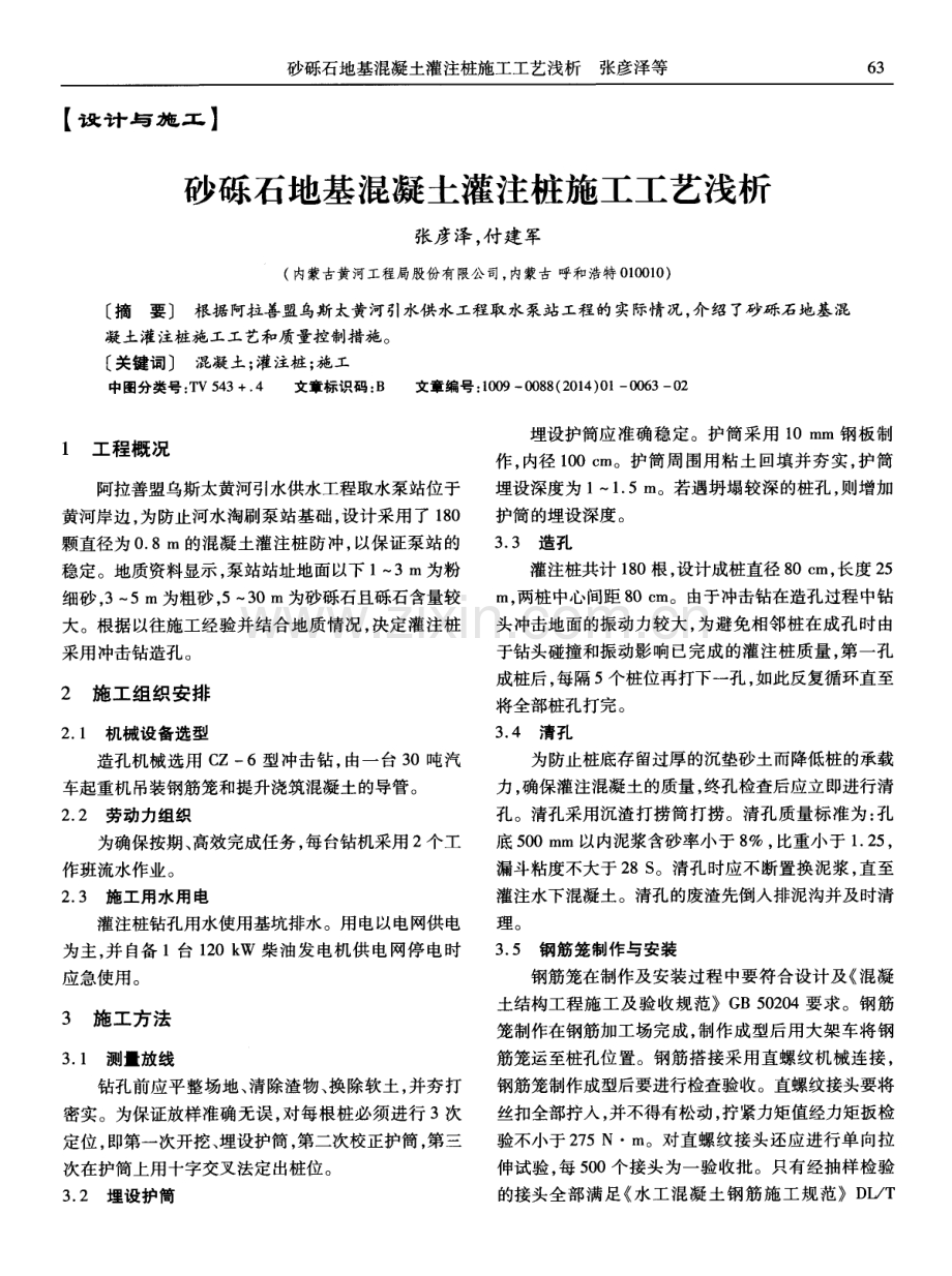 砂砾石地基混凝土灌注桩施工工艺浅析张彦泽等 6 3 【 设计与施工】 砂砾石地基混凝土灌注桩施工工艺浅析 张彦泽, 付建军 ( 内蒙古黄河工程局股份有限公司, 内蒙古 呼和浩特0 1 0 0 1 0 ) 摘要 根据阿拉善盟乌斯太黄河引水供水工程取水泵站工程的实际情况, 介 绍了砂砾石地基混 凝土灌注桩施工工艺和质量控制措施。 关键词 混凝土; 灌注桩; 施工 中图分类号: T V 5 4 3+ 4 文章标识码: B 文章编号: 1 0 0 9 0 0 8 8 ( 2 0 1 4 ) 0 l 一 0 o 6 3一 O 2 1 工程概况 阿拉善盟乌斯太黄河引水供水工程取水泵站位于 黄河岸边 , 为防止河水淘刷泵站基础 , 设计采用了 1 8 0 颗直径为 0 8 m的混凝土灌注桩 防冲, 以保证泵站的 稳定 。地质资料显示 , 泵站站址地面以下 1 3 m为粉 细砂 , 3 5 m为粗砂 , 5 3 0 m为砂砾石且砾石含量较 大。根据 以往施工经验并结合地质情况 , 决定灌注桩 采用 冲击钻造孔。 2 施工组织安排 2 1 机械设备选型 造孔机械选用 C Z一6型 冲击钻 , 由一 台 3 0吨汽 车起重机吊装钢筋笼和提升浇筑混凝土的导管。 2 2 劳动力组织 为确保按期、 高效完成任务, 每台钻机采用 2 个工 作班流水作业 。 2 3 施 工用 水 用 电 灌注桩钻孔用水使用基坑排水。用电以电网供 电 为主, 并 自备 1台 1 2 0 k W 柴油发 电机供 电网停 电时 应急使用。 3 施工方法 3 1 测量放线 钻孔前应平整场地、 清除渣物 、 换除软土 , 并夯 打 密实。为保证放样准确无误, 对每根桩必须进行 3次 定位 , 即第一次开挖 、 埋设护筒 , 第二次校正护筒 , 第三 次在护筒上用十字交叉法定出桩位。 3 2埋设护筒 埋设护筒应准确稳定 。护筒采 用 1 0 m m 钢板制 作 , 内径 1 0 0 c m。护筒周围用粘土 回填并夯实 , 护筒 埋设深度为 11 5 m。若遇坍塌较深 的桩孔 , 则增加 护筒的埋设深度。 3 3 造孔 灌注桩共计 1 8 0根 , 设计成桩直径 8 0 c m, 长度 2 5 m, 两桩中心间距 8 0 c m。由于冲击钻在造孔过程 中钻 头 冲击地面的振动力较大 , 为避免相邻桩在成孔时 由 于钻头碰撞和振动影 响已完成的灌注桩质量 , 第一孔 成桩后 , 每隔 5个桩位再打下一孔 , 如此反复循环直至 将全部桩孔打完 。 3 4清孔 为防止桩底存留过厚的沉垫砂土而降低桩的承载 力 , 确保灌注混凝土的质量 , 终孔检查后应立即进行清 孔 。清孔采用沉渣打捞筒打捞 。清孔质量标准为 : 孔 底 5 0 0 mm以内泥浆含砂率小于 8 , 比重小于 1 2 5, 漏斗粘度不大于 2 8 s 。清孔时应不断置换泥浆 , 直至 灌注水下混凝土。清孔的废渣先倒人排泥沟并及时清 理 。 3 5 钢筋笼制作与安装 钢筋笼在制作及安装过程 中要符合设计及 混凝 土结构工程施工及验收规范G B 5 0 2 0 4要求。钢筋 笼制作在钢筋加工场完成 , 制作成 型后用大架 车将钢 筋笼运至桩孔位 置。钢筋搭接采用直螺纹机械连接 , 钢筋笼制作成型后要进行检查验收。直螺纹接头要将 丝扣全部拧入 , 并不得有松动, 拧紧力矩值经力矩扳检 验不小于 2 7 5 N m。对直螺纹接 头还应进行单向拉 伸试验 , 每 5 0 0个接头为一验收批 。只有经抽样检验 的接头全部满足 水工混凝土钢筋施工规范D L T 内 蒙 古 水 利 2 0 1 4年第 1 期 ( 总第 1 4 9期) 5 1 6 9 2 0 0 2要求后方 准使用检验批材料 。由于本 工 程的灌注桩长度仅 为 1 2 5 m, 故钢筋笼 一次加工 成 型。钢筋笼的绑扎顺序为先将连接好的主筋间距布置 好 , 待固定住架立筋后 , 再按规定的间距绑扎箍筋。主 筋与架立筋之间的接点固定采用焊接的方法进行。主 筋不设弯钩 , 以免妨碍导管 的升降 , 钢筋笼 的内径应 比 导管接头处外径大 1 0 0 m m以上。 钢筋笼的堆放、 搬运和起吊应严格执行规程 , 同时 考虑入孔的顺序 、 钢筋笼的变形等因素。堆放时 , 支垫 数量必须满足要求 , 对于在堆放 、 搬运和起 吊过程中已 经发生变形的钢筋笼 , 应进行修整后再使用。 钢筋笼采用 吊车进行 吊装 , 安放时要对准孑 L 位 , 垂 直缓慢 的放入孔 内, 避免碰撞孔壁。钢筋笼安放到孔 内后 , 在护筒外设置 4个支墩 , 用两根 8钢管架住 钢筋笼支撑于支墩上。支墩要高于护筒顶 , 之后用十 字线找出钢筋笼 圆心使其与护筒轴心重合 , 然后在钢 筋笼外侧加设混凝土保护层垫块 , 以防钢筋笼侧 向位 移 。钢筋笼环向固定后 , 测 量钢筋笼顶端与设计高程 是否一致 , 否则调整架设钢筋笼 的多股 8 # 铅丝 , 使其 顶端与设计高程一致。 3 6混凝 土 的配制 与灌 注 ( 1 ) 混凝土设计指 标 : 本工程混凝土 的设计质量 指标为 C 2 5 、 W4 , 混凝土的坍落度控制在 1 82 2 e m, 粗骨料选用 5 2 0 m m和 2 0 4 0 mm的卵石 , 砂选用 中砂 , 水泥为 P O 4 2 5普通硅酸盐水泥。 ( 2 ) 混凝土灌注 : 混凝土灌注采用导管法进行灌 注 , 导管顶部设 置下料漏斗 , 导管采用 1 2 mm厚的钢 板制成 , 分节长度视工艺要求选用 , 直径为 3 0 0 m m。 接头采用插 口螺纹快速接头, 同时 , 要求导管及漏斗均 不得漏浆 、 挂浆 , 泄漏混凝土顺畅彻底 。导管底部设置 隔水栓 , 用橡皮球制成 , 使用的隔水栓应有较好的隔水 性能 。 开始浇筑混凝土时, 为使隔水栓能顺利排出 , 导管 底部至孔底的距离控制在 3 0 05 0 0 m m。混凝土灌人 前 , 应先在漏斗内灌人 0 1 0 2 m 的 1 :1 5水泥砂 浆 , 然后灌入混凝土。混凝土初灌量应能保证混凝土 灌人后导管埋入混凝土的深度不小于 0 8 m, 使导管 内混凝土柱和管外泥浆压力平衡 。待初灌混凝土