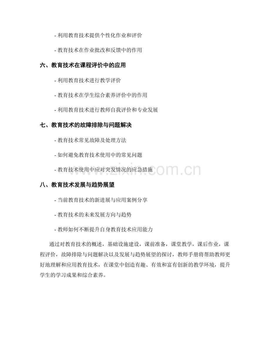 通过对教育技术的概述,基础设施建设,课前准备,课堂教学,课后作业,课程评价,故障排除与问题解决以及发展与趋势展望的探讨,教师手册将帮助教师更好地理解和应用教育技术,在课堂中创造有趣、有效和富有创新的教学环境,提升学生的学习成果和综合素养。