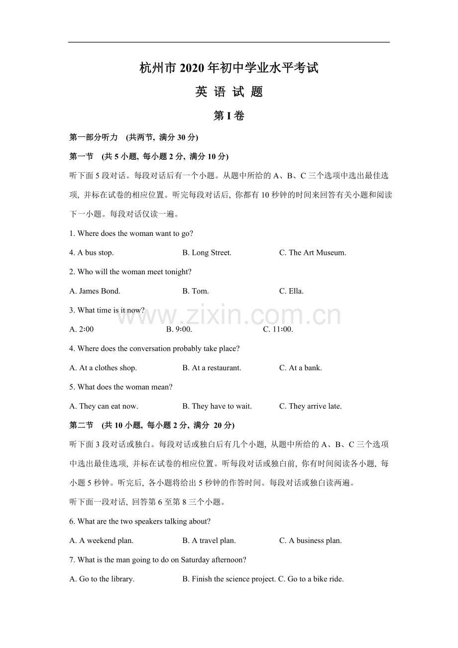 杭州市2020年初中学业水平考试