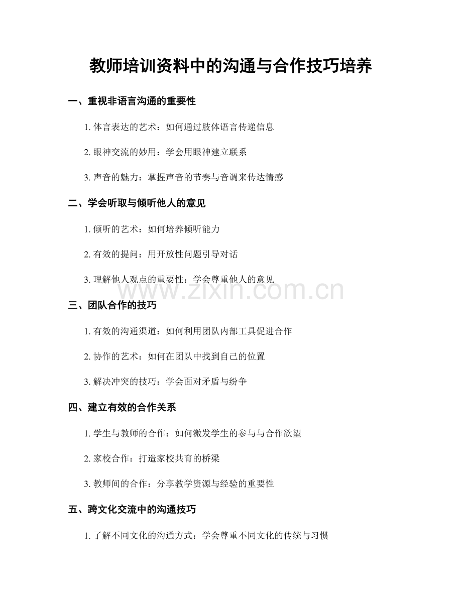 以上是关于教师培训资料中沟通与合作技巧培养的相关标题阐述,通过掌握这些技巧,教师们能够更好地与学生、家长以及其他教师进行沟通合作,提高教学效果,营造良好的教育环境。