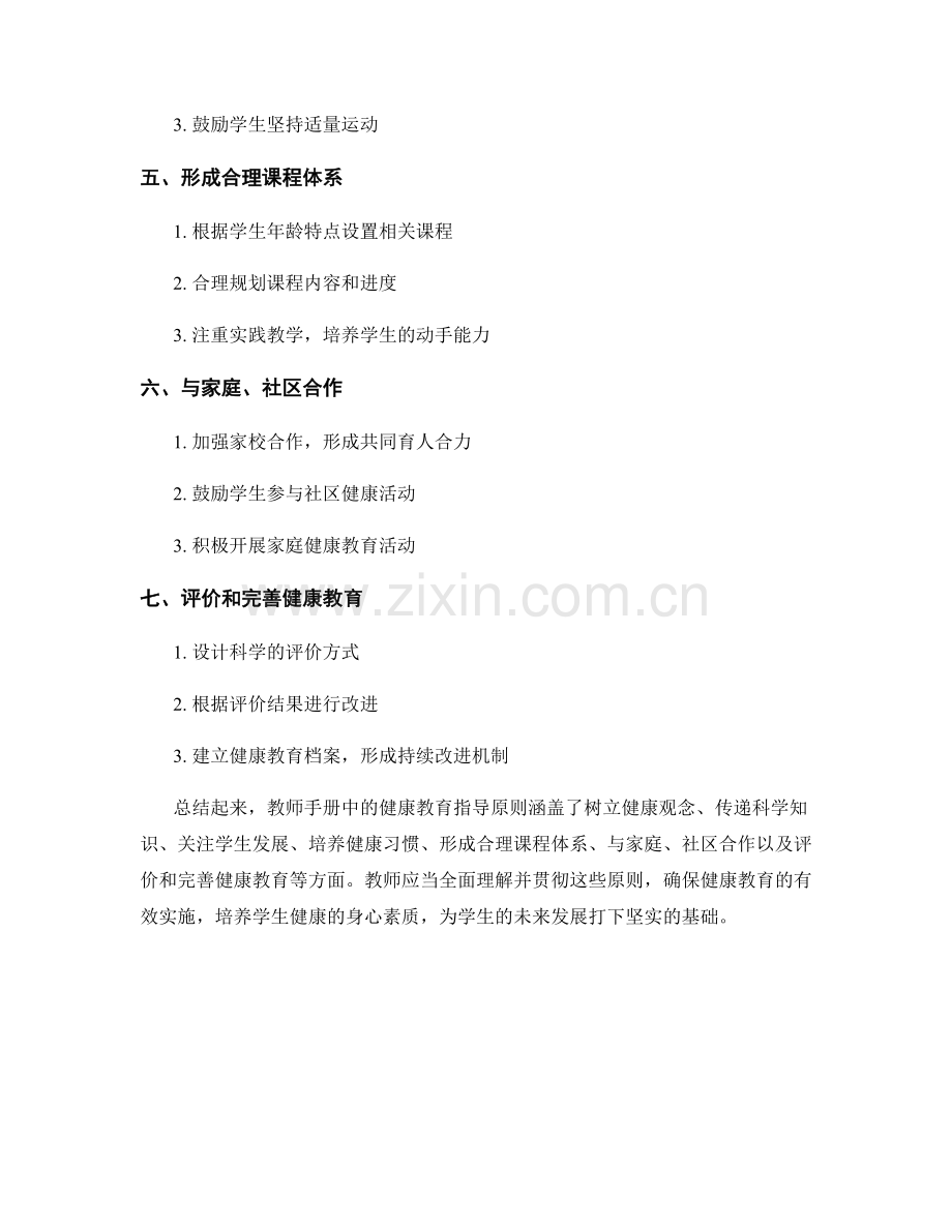 总结起来,教师手册中的健康教育指导原则涵盖了树立健康观念、传递科学知识、关注学生发展、培养健康习惯、形成合理课程体系、与家庭、社区合作以及评价和完善健康教育等方面。教师应当全面理解并贯彻这些原则,确保健康教育的有效实施,培养学生健康的身心素质,为学生的未来发展打下坚实的基础。