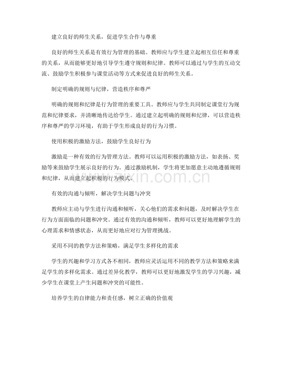 良好的师生关系是有效行为管理的基础。教师应与学生建立起相互信任和尊重的关系,从而能够更好地引导学生遵守规则和纪律。教师可以通过与学生的互动交流、鼓励学生积极参与课堂活动等方式来促进良好的师生关系。