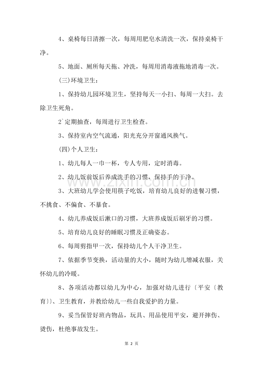 二、详细目标:切实抓好卫生保健工作,如:养分分析、餐前餐后管理及日常消毒等常规工作。严格掌握传染病,降低常见病的发病率,进一步提高幼儿的自我爱护力量,杜绝事故发生。严格执行卫生消毒制度,合理支配幼儿膳食,保证幼儿必需的养分,让幼儿身心得到健康成长。