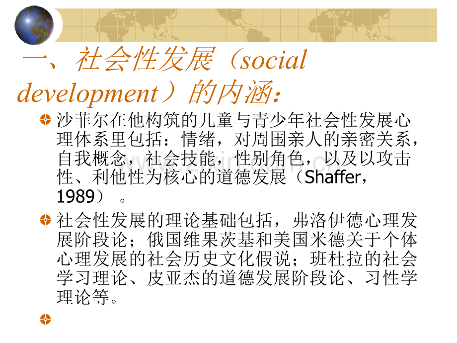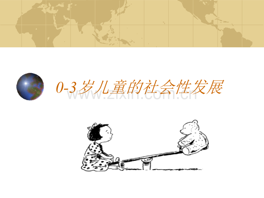 0-3岁儿童的社会性发展一、社会性发展(socialdevelopment)的内涵:沙菲尔在他构筑的儿童与青少年社会性发展心理体系里包括:情绪,对周围亲人的亲密关系,自我概念,社会技能,性别角色,以及以攻击性、利他性为核心的道德发展(Shaffer,1989)。社会性发展的理论基础包括,弗洛伊德心理发展阶段论;俄国维果茨基和美国米德关于个体心理发展的社会历史文化假说;班杜拉的社会学习理论、皮亚杰的道德发展阶段论、习性学理论等。二、儿童的气质特征与亲子互动的研究Thomas 等人提出了著名的气质九维度理论,并且认为“困难”(difficult)气质的儿童主要表现为经常出现消极情绪,经常哭闹,生理活动没有规律,易怒,难以适应新环境。儿童类型容易的慢慢活跃的困难的活动水平节律性分心探究与退缩适应性注意广度和持久性反应的强度反应性的阈限心境的性质(活动期于不活动期之比)(饿、排泄、睡眠和觉醒的节律)(外部刺激改变行为的程度)(对新的客体或人的反应)(儿童适应环境变化的容易性)(专心于活动的时间,分心对活动的影响)(反应的能量,不管它的性质或方向)(唤起一个可以分辨的反应所要求的刺激强度)(友好的、愉快的高兴的行为数量与不高兴不友好行为相比)较适中很有节律多变积极探究很易适应高或低低或适度的高或低积极的多变多变多变最初有退缩慢慢地适应高或低适度的高或低稍许否定的多变无节律多变退缩慢慢地适应高或低强烈的高或低否定的表表9-1亲子互动亲子互动研究始于20世纪30年代,近几年对这方面的研究非常热,主要研究集中在这几个方面:1、亲子互动影响因素的研究,包括父母的各种特征,如父母的教养方式、受教育水平等;儿童的特征,如气质、性别等;父母的社会网络与社会支持系统。2、亲子互动与儿童心理和行为发展的关系,如与同伴关系、认知发展、问题行为的关系等。三、有关依恋的研究三、有关依恋的研究1、依恋概述 婴儿在同照顾者的广泛接触交流中,建立了特殊的感情联系,这种感情联系被称为依恋(Attachment)。由于婴儿的照顾者多为其父母,尤以母亲居多,故又称为亲子依恋。依恋的几个阶段:第一阶段:无差别的社会反应阶段(出生3个月)第二阶段:有差别的社会反应阶段(36个月)第三阶段:依恋关系明确期(6个月24个月)第四阶段:目标调节阶段(24个月以后)。2、依恋的研究方法:陌生情境法(SS):Ainsworth等人所创Q-set:Waters和Deane提出 成人依恋访谈:由main等人所创 3、依恋类型A类型:回避的(avoidant)。这类儿童对母亲在 场或不在场影响不大。其接受陌生人的安慰就像接受母亲的安慰一样。实际上这类儿童并未形成对人的依恋,所以又称“无依恋的儿童”。B类型:安全的(Securely attached)。这类儿童与母亲在一起时能安逸地玩弄玩具,对陌生人的反应比较积极并不总是偎依在母亲身边。C类型:反抗的(resistant)。这类儿童逢到母亲要离开之前,总显得很警惕,有点大惊小怪。如果母亲要离开他,他就会表现的极度的反抗。但是与母亲在一起时又无法把母亲作为他安全探究的基地。四、婴儿的情绪发展四、婴儿的情绪发展任何改变人与环境关系的因素都将产生情感,只要这种关系对此人来说是有有意义的。婴儿在成长过程中与环境有关的行为发展包括达到、爬行、步行,这些均与情绪的发展密切相关。当婴儿开始学会爬行之后,可能诱发来自照顾者的更加积极的情感,如快乐、骄傲等,一旦父母习惯了儿童新的运动技能,他们就开始鼓励孩子去探索和参与新的活动,解决新问题。1、情绪感染(EmotionContagion)情绪感染是如何使婴儿对一个情绪信号所携带的快乐的音调和信息敏感的?如果婴儿能体验到与另一个人所表达的情绪类似的情绪,他们就有可能在早年发现其他人 发出的信号的意义。Hatfield和他的同事(1994)各种情绪感染产生的机制:有意识的认知过程,无条件和条件反射,以及动作模仿与反馈。2、社会信号与行为调节(SocialSignalingandRegulation)情绪信号的适当运用取决于两个方面:其一是对不同情绪表达的特定意义的理解,并能据此作出相应的反应;其二是对情绪信号的参照本质的理解,并能将情绪信号与环境中的特定事件相联系。前者称为情感特性(Affect specificity),后者称为参照特性(Referent specificity)。3、三种社会参照研究程序视觉悬崖实验陌生人实验新奇玩具五、亲社会与道德行为的研究五、亲社会与道德行为的研究 霍夫曼(1975)提出了一个假说:从出生到2岁期间,幼儿通过条件反射,发展出一个亲社会行为的“基本形式”。最初这个基本形式是移情导致的痛苦驱动的,后来是同情导致的痛苦驱动的,在这个过程中,儿童越来越能够意识到自己与他人的区别,注意力越来越多地指向他人的需要,这样,亲社会行为的基本形态就产生了 研究案例:伯比,82周:当我(母亲)正在吸尘时,我感到有些软弱无力、胃不舒服、直想吐。我放下吸尘器,跑进卫生间一阵咳嗽、呕出一些东西。伯比跟着我到了卫生间门口,我呆在那儿的整个时间里,他一直在敲卫生间门,并说:“妈咪,好些吗?妈咪,好些吗?”。终于,我走出卫生间,抱起了伯比,他很关切地看着我,他的眼睛里充满焦虑的神情,我说:“妈咪没事了。”然后他把头靠在我的肩膀上,开始对我表示亲热。DeborahJ.Laible和RossA.Thompson的研究:研究中涉及情绪、规则、后果和道德评价的内容:需要、意图和愿望情绪(