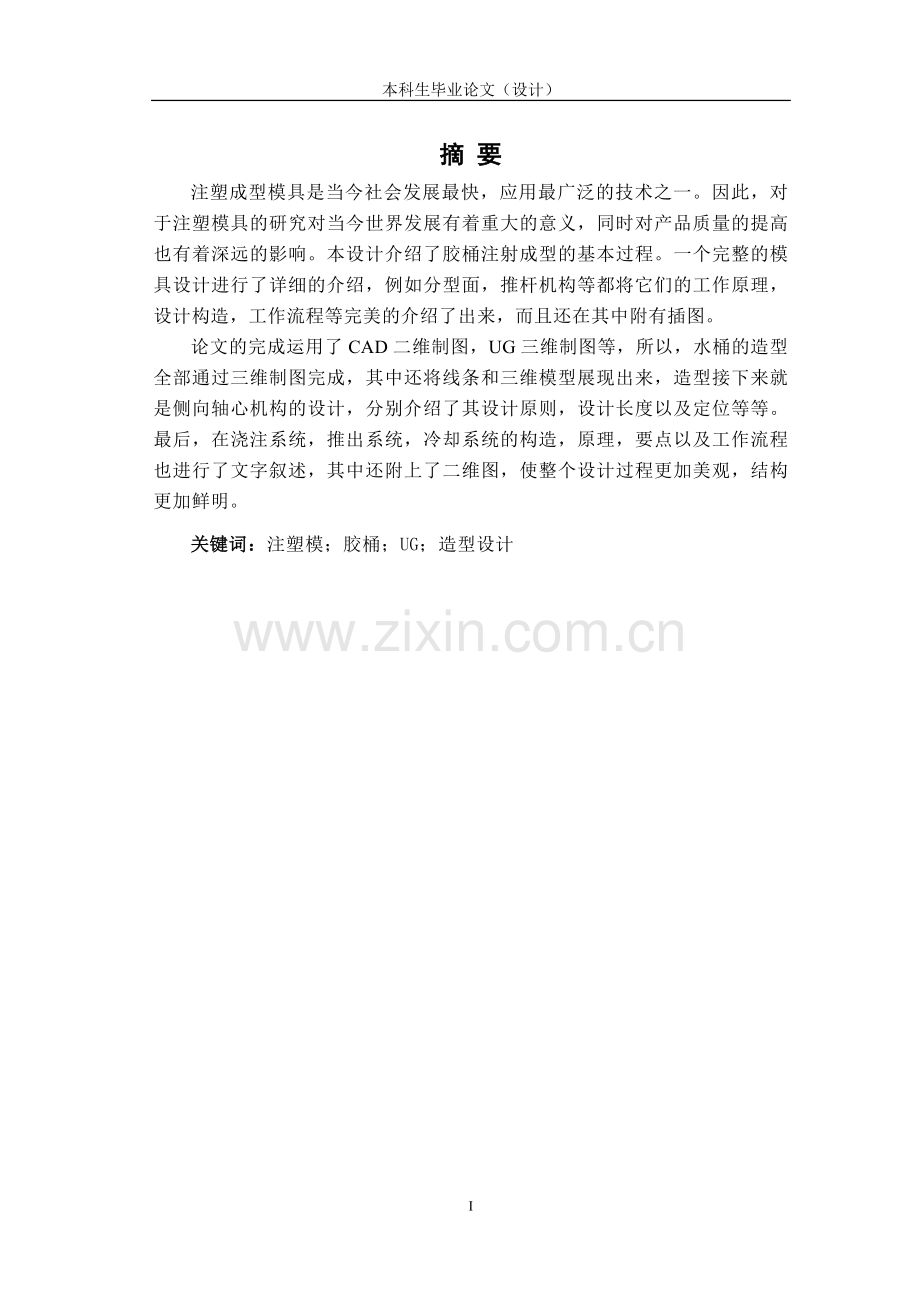 论文的完成运用了CAD二维制图,UG三维制图等,所以,水桶的造型全部通过三维制图完成,其中还将线条和三维模型展现出来,造型接下来就是侧向轴心机构的设计,分别介绍了其设计原则,设计长度以及定位等等。最后,在浇注系统,推出系统,冷却系统的构造,原理,要点以及工作流程也进行了文字叙述,其中还附上了二维图,使整个设计过程更加美观,结构更加鲜明。