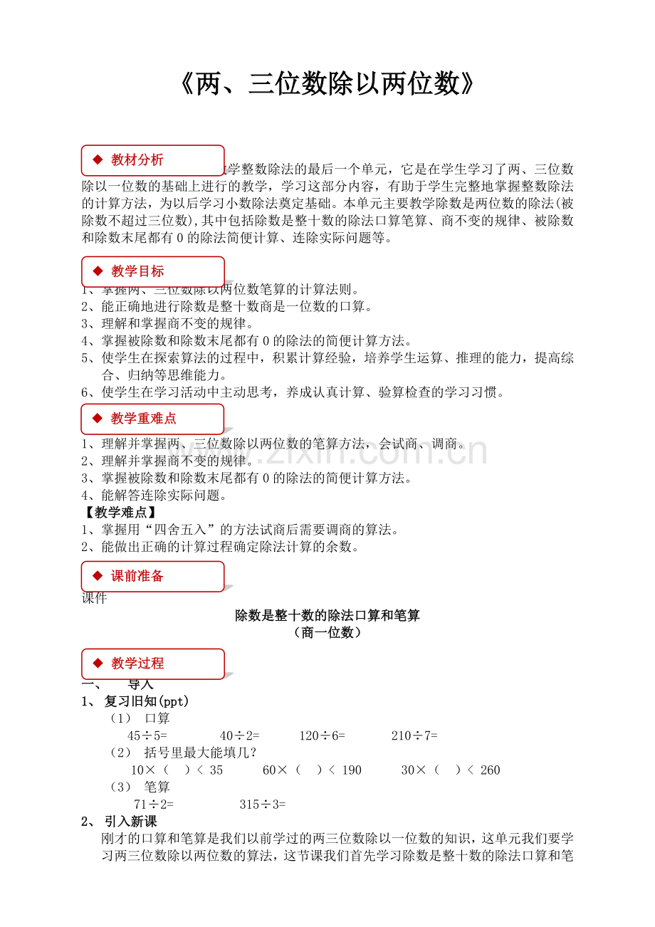 1、 掌握两、三位数除以两位数笔算的计算法则。