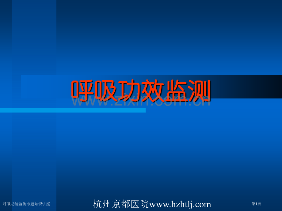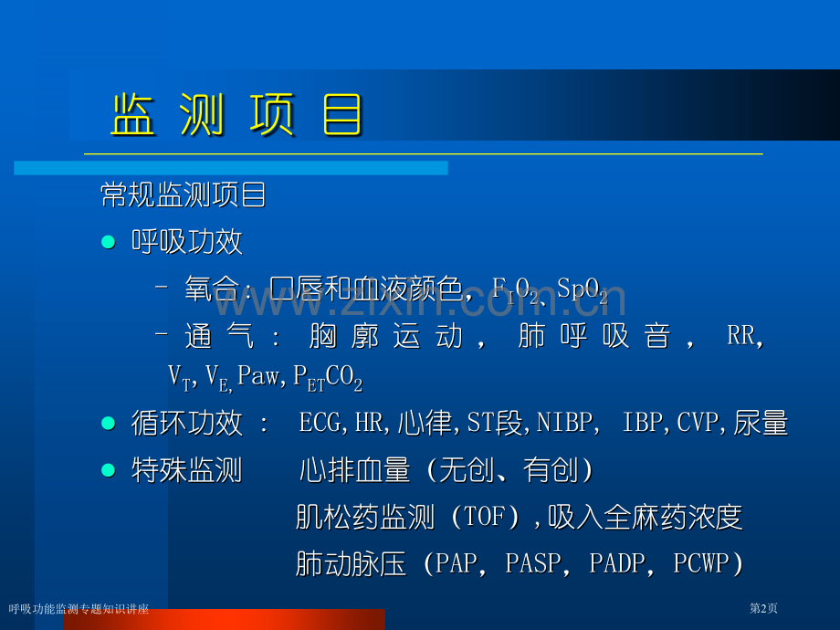 呼吸功效监测呼吸功效监测杭州京都医院 呼吸功能监测专题知识讲座第1页 监 测 项 目常规监测项目常规监测项目l l呼吸功效呼吸功效 氧合:口唇和血液颜色,氧合:口唇和血液颜色,F FI IO O2 2、SpOSpO2 2 通通 气气:胸胸 廓廓 运运 动动,肺肺 呼呼 吸吸 音音,RRRR,V VT T,V,VE,E,Paw,PPaw,PETETCOCO2 2l l循环功效循环功效:ECG,HR,ECG,HR,心律心律,STST段段,NIBP,IBP,CVP,NIBP,IBP,CVP,尿量尿量l l特殊监测特殊监测 心排血量(无创、有创)心排血量(无创、有创)肌松药监测(肌松药监测(TOFTOF),吸入全麻药浓度吸入全麻药浓度 肺动脉压(肺动脉压(PAPPAP,PASPPASP,PADPPADP,PCWPPCWP)呼吸功能监测专题知识讲座第2页呼吸过程l外呼吸肺、胸腔运动将氧气直接输入血液外呼吸肺、胸腔运动将氧气直接输入血液及二氧化碳经血液弥散排出过程及二氧化碳经血液弥散排出过程l内呼吸组织内部利用氧和排出二氧化碳细内呼吸组织内部利用氧和排出二氧化碳细胞内交换过程胞内交换过程呼吸功能监测专题知识讲座第3页肺功效监测肺功效监测l肺容量测定:肺容量测定:VTVT、IRVIRV、ERVERV、RVRV、ICIC、VCVC、FRC FRC、TLCTLCl肺通气功效测定:肺通气功效测定:VEVE、VAVA、MVVMVV、TVCTVC、VDVDl肺换气功效测定:肺换气功效测定:VAVAQCQC、Qs/QtQs/Qtl肺呼吸动力功效测定:肺呼吸动力功效测定:C C、RawRaw、WOBpWOBp呼吸功能监测专题知识讲座第4页肺容量l潮气量(VT):平静呼吸时,一次吸入或呼出气量,正常成年男性603ml,女性为487ml,平均500ml。l补吸气量(IRV):平静吸气后,用力做最大吸气时所能吸入气量,男性2.16L,女性1.4L。l补呼气量(ERV):平静呼气后,用力做最大呼气时所能呼出气量,男性0.91L,女性0.56L。l余气量(RV):深呼气后再也不能呼出肺内残气量,男性1.53L,女性1.02L。呼吸功能监测专题知识讲座第5页肺容量l深吸气量(IC):平静呼气后,作最大吸气所能吸入最大气量,即潮气量与补吸气量之和,正常成年男性2.66L,女性1.9L。l肺活量(VC):最大吸气之后最大呼气所测出气量,正常成年男性为3.47L,女性为2.44L。l功效残气量(FRC):平静呼气后肺内所残留气量,正常成年男性为2.33L,女性为1.58L。l肺总量(TLC):最大吸气后存留于肺部全部气量,正常成年男性为5.02L,女性为3.462L。呼吸功能监测专题知识讲座第6页肺通气肺通气 肺通气是指呼吸运动将氧气吸入肺中,同时排出二氧化碳过程,反应肺呼吸生理动态改变。l通气量(VE)在静息状态下每分钟呼出或吸入气量,是潮气量与每分钟呼吸频率。正常值:男性6.6L,女性4.2L。l肺泡通气量(VA)在静息状态下每分钟吸入气量中所抵达肺泡进行气体交换有效通气量。VA=f(VT-VD)。正常值:4.2L。呼吸功能监测专题知识讲座第7页肺通气肺通气l最大通气量(MVV)是指每分钟用力呼出和吸入最大气量,评定通气贮备功效,男性104L,女性82.5L。l时间肺活量(TVC)深吸气后用最快速度,最大用力呼气所能呼出全部气量。时间最大呼气率(FEV):呼出气占用力肺活量百分比。FEV1.0%83,FEV2.0%96,FEV3.0%99。呼吸功能监测专题知识讲座第8页解剖无效腔 与 肺泡无效腔l生理死腔量(VD)由解剖无效腔与肺泡无效腔组成。l解剖无效腔:口鼻气管和细支气管这一段呼吸道,正常值:男性0.128L,女性0.119L.l肺泡无效腔:一部分在肺泡中未能与血流发生气体交换空间VD/VT正常值:0.20.35.呼吸功能监测专题知识讲座第9页肺换气肺换气 换气系人体经过呼吸作功,肺泡将外界氧弥散到肺毛细血管中,并把二氧化碳从血中弥散到肺泡,然后排出体外过程。l通气血流比(VA/QC)正常人每分钟肺泡通气量(VA)为4L,肺血流量(QC)为5L,则VA/QC为0.8。通气量血流量(比值升高),表示无效腔量增加。血流量通气量(比值降低),表示产生肺内分流。呼吸功能监测专题知识讲座第10页l肺泡动脉氧差(AaDO2)正常值在吸入空气1.330.67kpa,吸入氧时为6.672.67kpa.AaDO2增大则反应弥散或分流异常。l肺动脉静脉分流量(Qs)和分流率(Qs/Qt)Qs是指每分钟从右室排出血流,未经氧合而直接入左心血流量,Qs/Qt是指分流量和心排出量比率。正常值7。肺换气肺换气呼吸功能监测专题知识讲座第11页肺呼吸动力l顺应性(C):单位压力改变时容积改变,反应肺与胸廓弹性特征。总顺应性0.1L/cmH2O。l气道阻力(Raw):气流在气道内流动时所碰到阻力。13 cmH2OLS。升高常见原因:1)气管内径缩小;2)气管导管内径过小或接头过细过长。l呼吸功(WOBp):呼吸时所作机械功压力容积。0.24kgm/min。呼吸功能监测专题知识讲座第12页呼吸运动监测呼吸运动监测l呼吸频率:正常成人10-18bpm新生儿40bpm1岁儿童25bpm8岁儿童18bpml呼吸运动幅度、节律、呼吸周期比率l胸腹式呼吸活动观察呼吸功能监测专题知识讲座第13页呼吸方式观察l男性及儿童呼吸方式以膈肌运动为主,胸廓上部和上腹部活动较显著,形成所谓腹式呼吸。l女性呼吸以肋间肌运动较为主要,形成所谓胸式呼吸,实际上这两种呼吸单独存在机会少。呼吸功能监测专题知识讲座第14页呼吸运动监测呼吸运动监测l呼吸音监测:呼吸音强度、音调、时相、性质改变。l呼吸状态观察 上呼吸道梗阻:三凹征-吸气相出现胸骨上窝,锁骨上窝,肋间隙向内凹陷 下呼吸道梗阻:呼出气流不畅,呼气用力,呼气时间延长。呼吸功能监测专题知识讲座第15页基本正常基本正常轻度减退轻度减退中度减退中度减退重度减退重度减退呼吸衰竭呼吸衰竭VC(实实/预预)818071705150218180717051502183836160414095949390898211.6(87)11.6(87)11.610.0(8760)9.88.0(7460)8.0(60)PaCO2