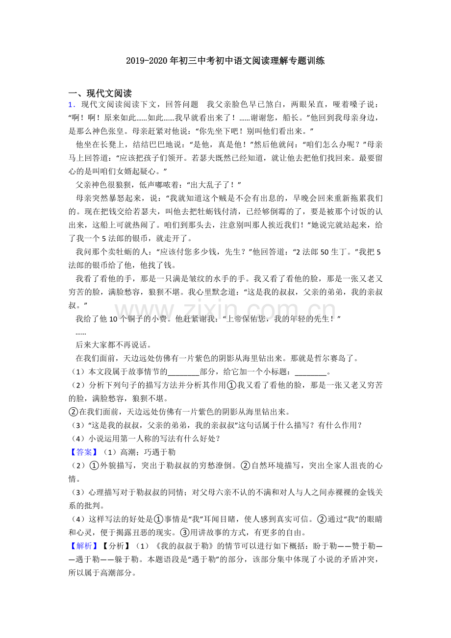 【解析】【分析】(1)《我的叔叔于勒》的情节可以进行如下概括:盼于勒——赞于勒——遇于勒——躲于勒。本题语段是“遇于勒”的部分,该部分集中体现了小说的矛盾冲突,所以属于高潮部分。