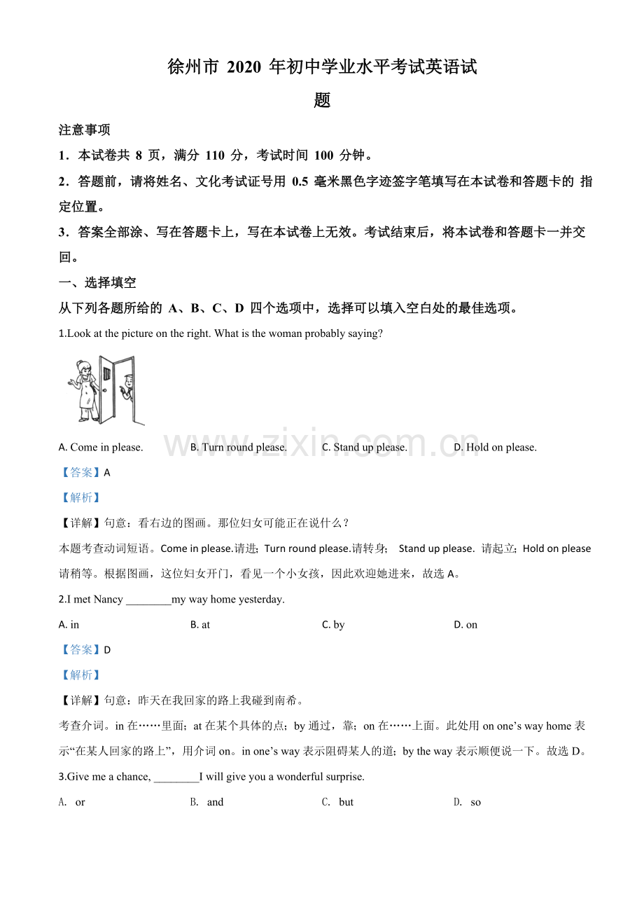 本题考查动词短语。Come in please.请进;Turn round please.请转身; Stand up please. 请起立;Hold on please请稍等。根据图画,这位妇女开门,看见一个小女孩,因此欢迎她进来,故选A。