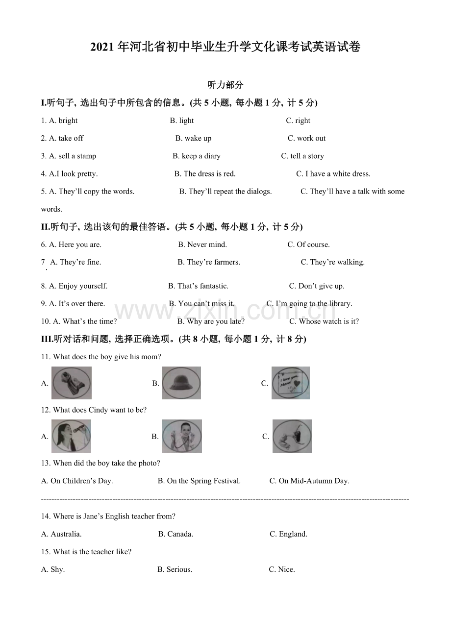 2021年河北省初中毕业生升学文化课考试英语试卷