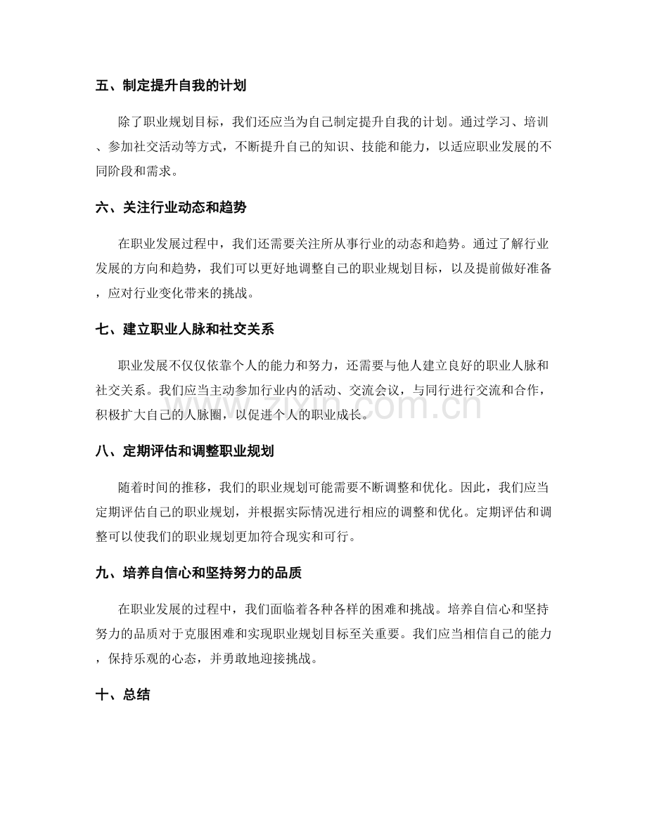在总结职业发展历程的基础上,我们需要明确自己未来的职业规划目标。这些目标应当合理、明确、具有挑战性,同时也要与自己的兴趣和能力相匹配。明确目标有助于我们在未来的职业生涯中更好地规划和决策。