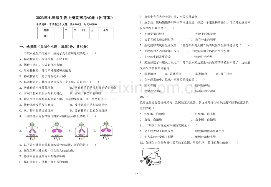 考试说明:本试卷五个大题,满分100分,时间90分钟。