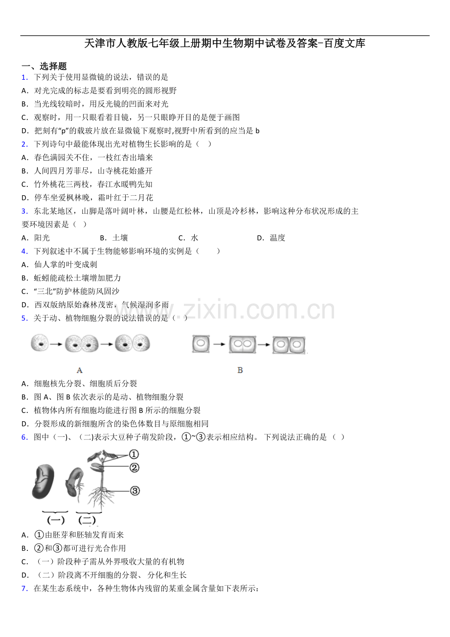 天津市人教版七年级上册期中生物期中试卷及答案-百度文库