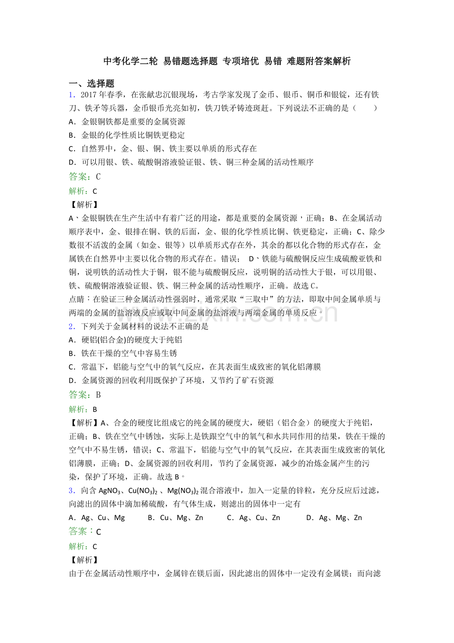 中考化学二轮 易错题选择题 专项培优 易错 难题附答案解析
