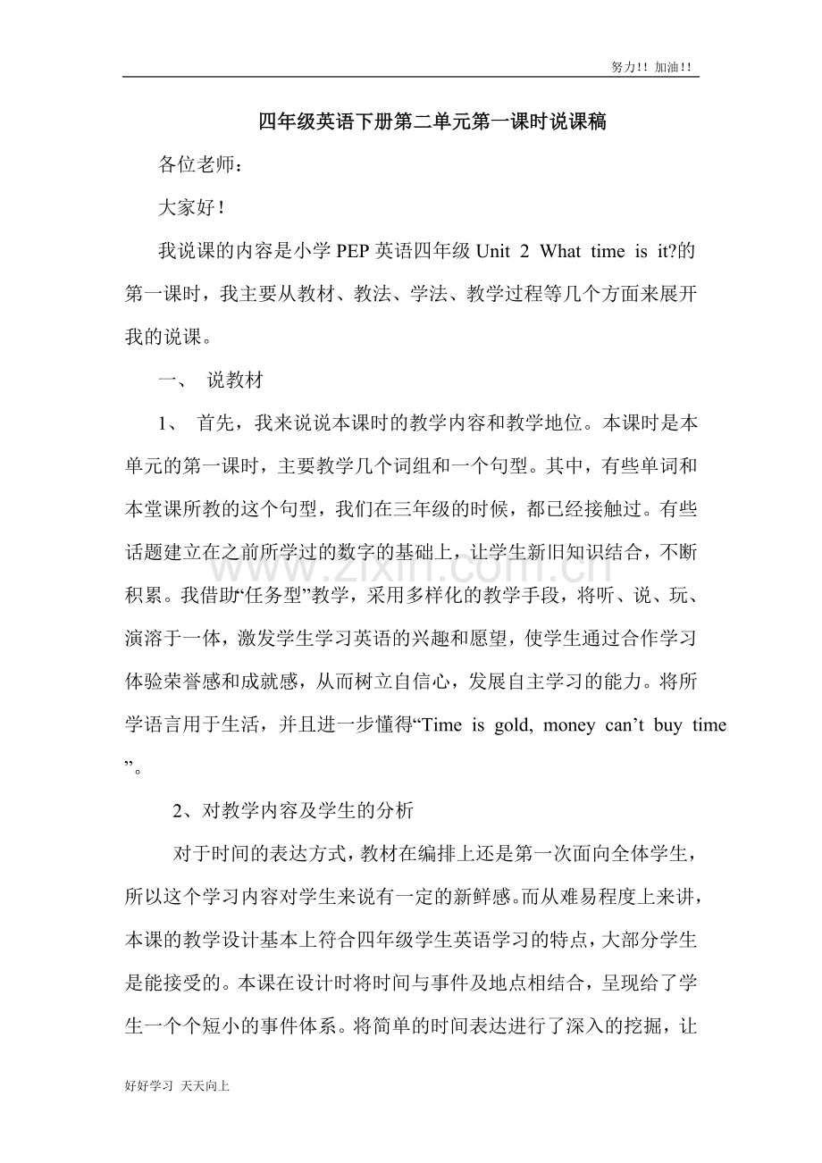 我说课的内容是小学PEP英语四年级Unit 2 What time is it?的第一课时,我主要从教材、教法、学法、教学过程等几个方面来展开我的说课。