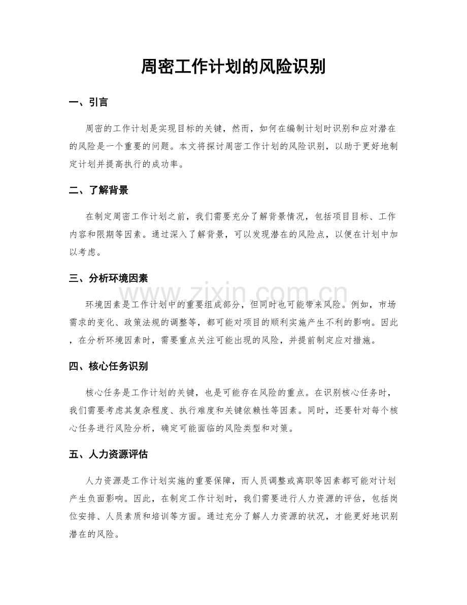 总之,周密工作计划的风险识别是一个全面细致的过程,它需要深入了解背景、分析环境因素、识别核心任务、评估人力和技术资源等。通过制定风险管理计划、监测与控制风险,并采取适当的风险应对策略,可以较好地保障工作计划的顺利执行。