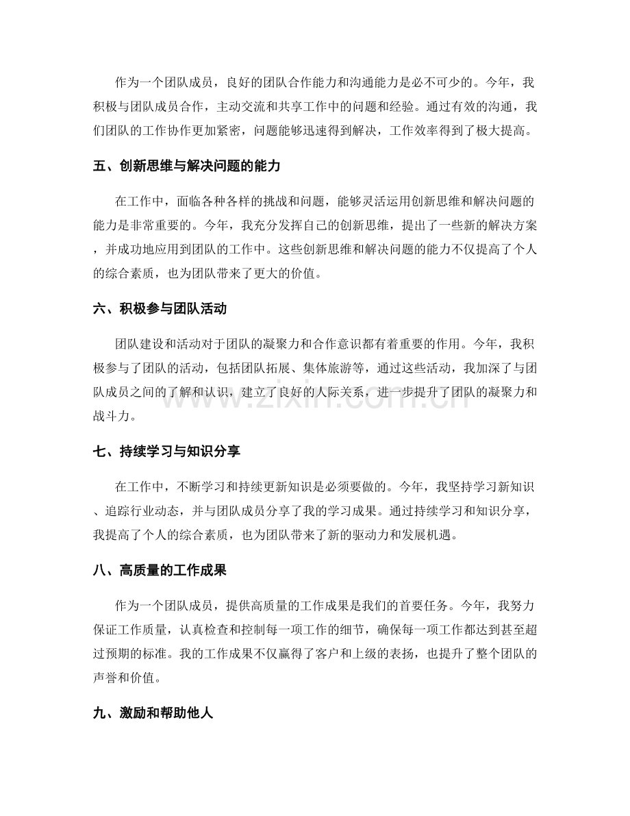 作为一个团队成员,我深知激励和帮助他人是建设团队和提升团队价值的重要一环。今年,我积极鼓励和帮助团队成员,关心他们的困难和问题,并主动提供帮助。通过我的激励和帮助,团队成员们更加积极主动地投入工作中,取得了良好的工作成效。