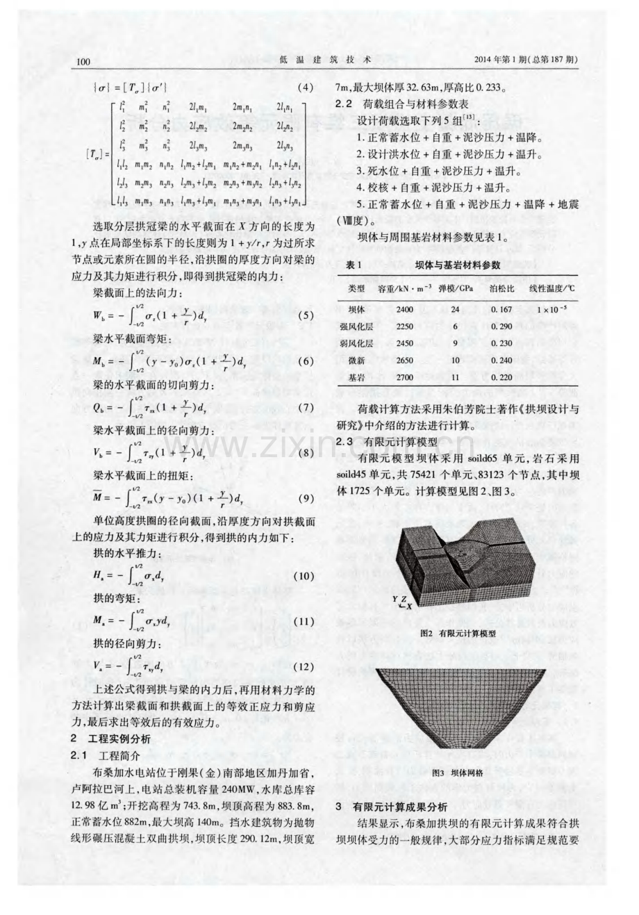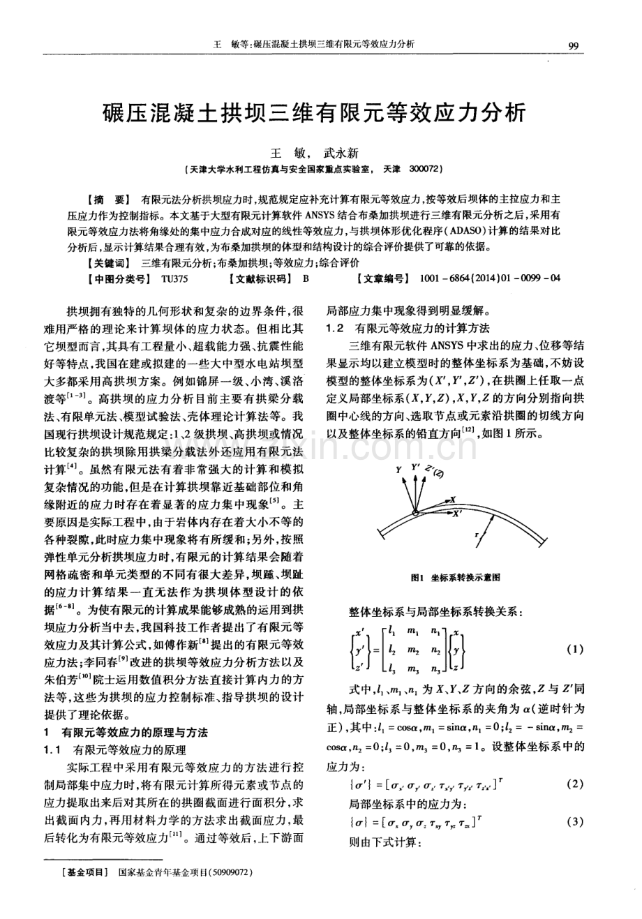 王敏等: 碾压混凝土拱坝三维有限元等效应力分析 碾压混凝土拱坝三维有限元等效应力分析 王敏, 武永新 ( 天津大学水利工程仿真与安全国家重点实验室。 天津3 0 0 0 7 2 ) 【 摘要】 有限元法分析拱坝应力时, 规范规定应补充计算有限元等效应力 , 按等效后坝体的主拉应力和主 压应力作为控制指标。本文基于大型有限元计算软件 A N S Y S 结合布桑加拱坝进行三维有限元分析之后, 采用有 限元等效应力法将角缘处的集中应力合成对应的线性等效应力 , 与拱坝体形优化程序( A D A S O) 计算的结果对比 分析后, 显示计算结果合理有效, 为布桑加拱坝的体型和结构设计的综合评价提供了可靠的依据。 【 关键词】 三维有限元分析; 布桑加拱坝 ; 等效应力; 综合评价 【 中图分类号】 T U 3 7 5 【 文献标识码】 B 【 文章编号】 1 0 0 1 6 8 6 4 ( 2 0 1 4 ) O l O O 9 9 一 o 4 拱坝拥有独特的几何形状和复杂的边界条件 , 很 难用严格的理论来计算坝体的应力状态。但相比其 它坝型而言, 其具有工程量小、 超载能力强、 抗震性能 好等特点, 我国在建或拟建的一些大中型水电站坝型 大多都采用高拱坝方案。例如锦屏一级、 小湾、 溪洛 渡等 。高拱坝 的应力分析 目前主要有拱梁分载 法、 有限单元法、 模型试验法 、 壳体理论计算法等。我 国现行拱坝设计规范规定 : 1 、 2级拱坝、 高拱坝或情况 比较复杂的拱坝除用拱梁分载法外还应用有限元法 计算 。虽然有限元法有着非常强大的计算和模拟 复杂情况的功能, 但是在计算拱坝靠近基础部位和角 缘附近 的应 力 时存 在着 显著 的应 力集 中现象 。主 要原因是实际工程 中, 由于岩体内存在着大小不等的 各种裂隙, 此时应力集中现象将有所缓和; 另外 , 按照 弹性单元分析拱坝应力时, 有限元的计算结果会随着 网格疏密和单元类型的不同有很大差异, 坝踵、 坝趾 的应力计算 结果一直无法作为拱坝体 型设计 的依 据 】 。为使有限元的计算成果能够成熟的运用到拱 坝应力分析当中去, 我国科技工作者提出了有限元等 效应力及其计算公式 , 如傅作新 提 出的有限元等效 应力法 ; 李同春 改进的拱坝等效应力分析方法以及 朱伯芳 。 。 院士运 用数值 积分 方法 直接计 算 内力 的方 法等, 这些为拱坝的应力控制标准、 指导拱坝的设计 提供了理论依据。 1 有限元等效应力的原理与方法 1 1 有限元等效应力的原理 实 际工 程 中采用 有 限元等 效应 力 的方 法 进行 控 制局部集中应力时, 将有限元计算所得元素或节点的 应力提取出来后对其所在的拱圈截面进行面积分, 求 出截面 内力 , 再用材料力学的方法求出截面应力, 最 后转化为有限元等效应力 。通过等效后, 上下游面 基金项目】 国家基金青年基金项 目( 5 0 9 0 9 0 7 2 ) 局部应力集中现象得到明显缓解。 1 2 有限元等效应力的计算方法 三维有限元软件 A N S Y S中求出的应力、 位移等结 果显示均以建立模型时的整体坐标系为基础 , 不妨设 模型的整体坐标系为( , y , , Z ) , 在拱圈上任取一点 定义局部坐标系( , l , , z ) , , l , , z的方向分别指向拱 圈中心线的方向、 选取节点或元素沿拱圈的切线方向 以及整体坐标系的铅直方向 , 如图 1 所示。 图1 坐标系转换示意 图 1 】 式中, Z 、 m。 、 。 为 X、 Y 、 Z方 向的余弦, Z与 Z 同 轴, 局部坐标系与整体坐标 系的夹角为 ( 逆时针为 C O S O , n 2 = 0 ; z 3 = 0 , m 3 = 0 , ,3 =1 。设整体坐标系中的 o r = o r , or or z , 7 -, v , 丁 。 ( 2 ) or _ or or or : F r r ( 3 ) 1 0 2 低温建筑技术 2 0 1 4 年第 1 期( 总第 1 8 7期) 轴线呈对称规律, 大小 为 1 7 3 M P a ( 坝面 1 24 5 处) , 第三主应力 1 0 9 M P a ( 坝体与坝肩交界处) ; 坝体 下游第三主应力在坝体大部分区域也基本沿着河谷 中轴线对称分布, 坝体下游面第一主应力为 0 4 8 MP a ( 坝顶与坝肩交界处 ) , 最 大压应力 9 4 5 MP a ( 坝趾 处 ) 。 4 等效应力与拱坝体形优化程序( A D A S O ) 结果的对 比分析 本文为了对 比分析, 还采用了另一种拱坝应力计 算方法: 中国水利水 电科学研究院结构材料所编制的 拱坝体形优化程序 ( A D A S O ) , 该程序采用多拱梁法 计算原理编制。等效应力值与 A D A S O计算值的对 比 分析表见表2 。 通过表3可以发现, 在基本组合和特殊组合( 非 地震) 工况下, 等效前坝体的最大拉应力和压应力峰值 大小为 1 7 3 M P a和 1 2 0 0 M P a , 等效后分别为 1 1 1 M P a 和 6 1 7 M P a , 各项工况下等效后的最大应力峰值明显 降低, 且分布部位、 趋势和大小与 A D A S O求得的结果 大致相同, 有限元等效应力法求得的主拉应力值稍大 一 些, 主压应力值大致相当。坝体在基本组合工况及 特殊荷载组合( 非地震) 工况下应力满足规范要求, 在 地震工况下稍大 , 建议下阶段进行坝体体形优化、 考 虑横缝张开及其它抗震措施, 使应力进一步改善, 以 满足规范要求。有限元坝体应力控制标准见表 3 。 表 3 有限元坝体应力控制标准 5结 语 有限元等效应力法是新规范规定的 1 、 2级拱坝、 高拱坝的应力强度校核方法, 它将有限元强大的计算 能力和处理坝体开孔、 体型局部变化和复杂地基的能 力相结合, 使计算精度和结果更加准确。基于以上对 比分析可以看出, 运用 A N S Y S的拱坝等效应力计算结 果与 A D A S O计算结果的应力分布规律基本一致 , 等 效结果可靠有效 , 与采用结构力学的计算方法相