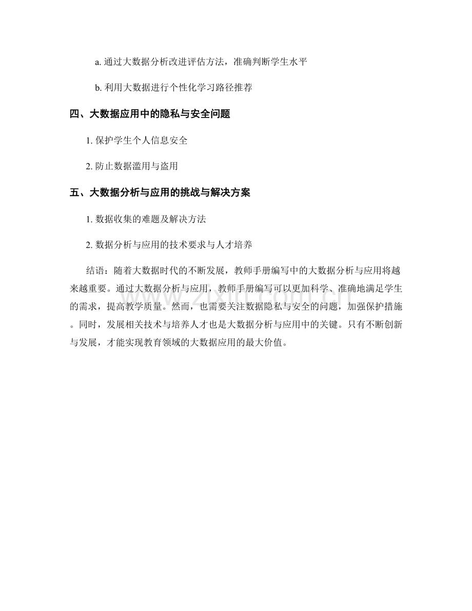 结语:随着大数据时代的不断发展,教师手册编写中的大数据分析与应用将越来越重要。通过大数据分析与应用,教师手册编写可以更加科学、准确地满足学生的需求,提高教学质量。然而,也需要关注数据隐私与安全的问题,加强保护措施。同时,发展相关技术与培养人才也是大数据分析与应用中的关键。只有不断创新与发展,才能实现教育领域的大数据应用的最大价值。