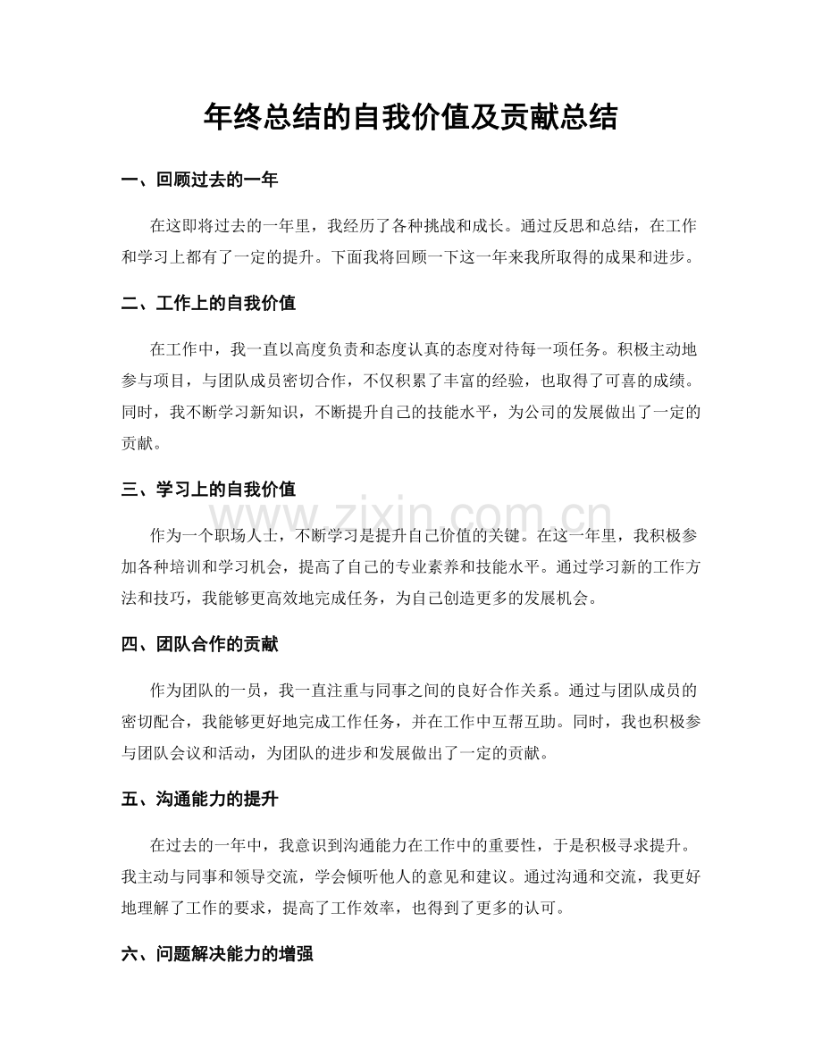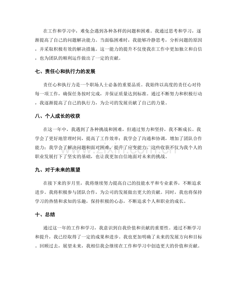 通过这一年的工作和学习,我意识到自我价值和贡献的重要性。通过不断学习和提升,我已经取得了一定的成果和进步。我也更加明确了未来的发展方向和目标。回顾过去,展望未来,我相信我会继续在工作和学习中创造更大的价值和贡献。