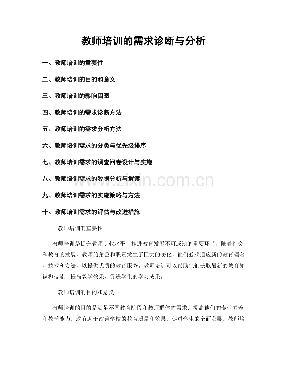 通过以上的相关标题,我们对教师培训的需求诊断与分析有了更具体的了解。教师培训的重要性、目的和意义,影响因素、需求诊断和分析方法,以及相应的实施策略和评估措施,都是建立一个高效的教师培训体系所必须考虑的要素。只有深入了解教师的需求,准确把握培训的方向和内容,才能提升教师的专业水平,促进教育事业的发展。