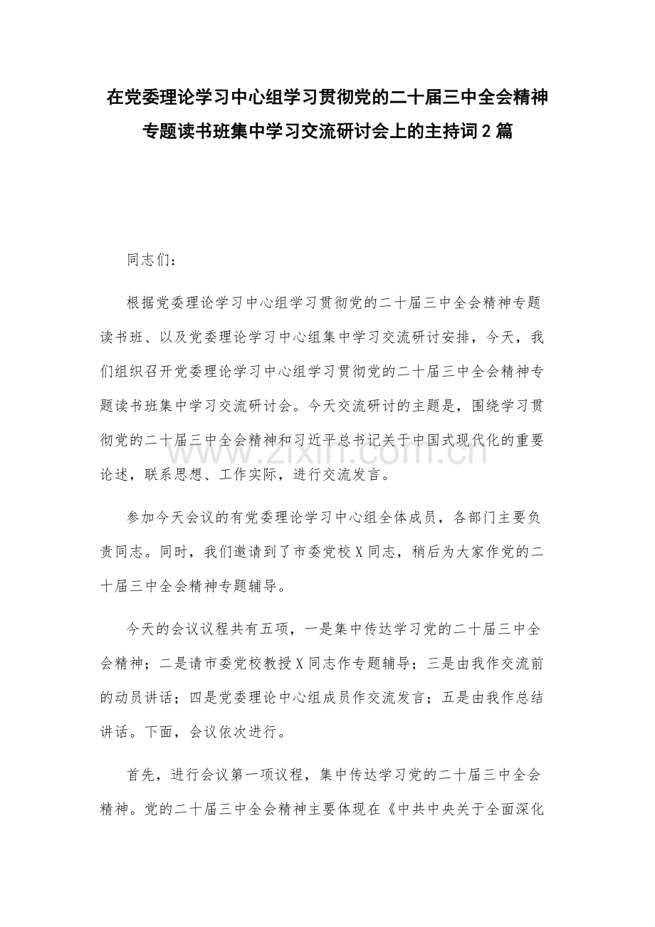 在党委理论学习中心组学习贯彻党的二十届三中全会精神专题读书班集中学习交流研讨会上的主持词2篇
