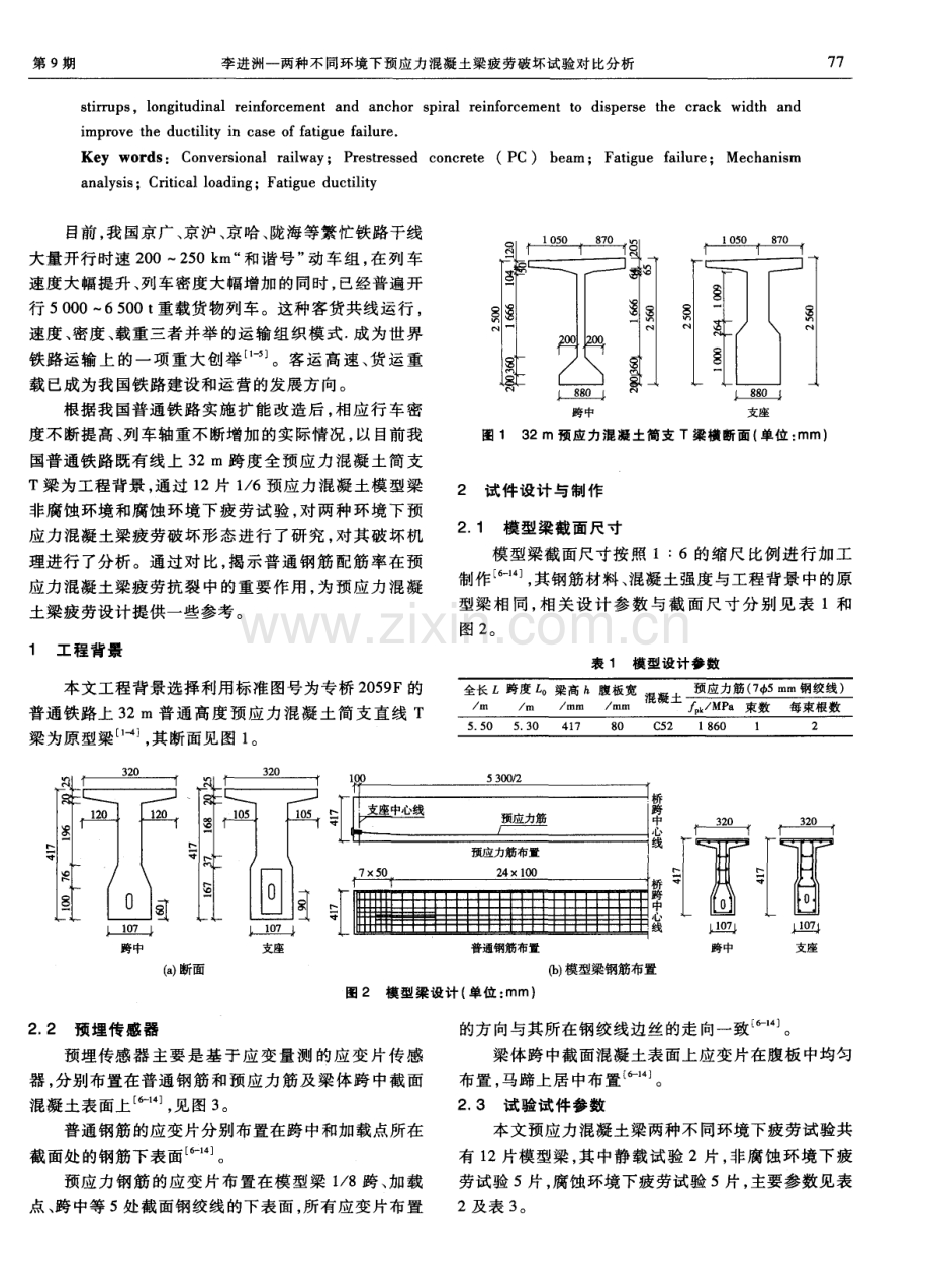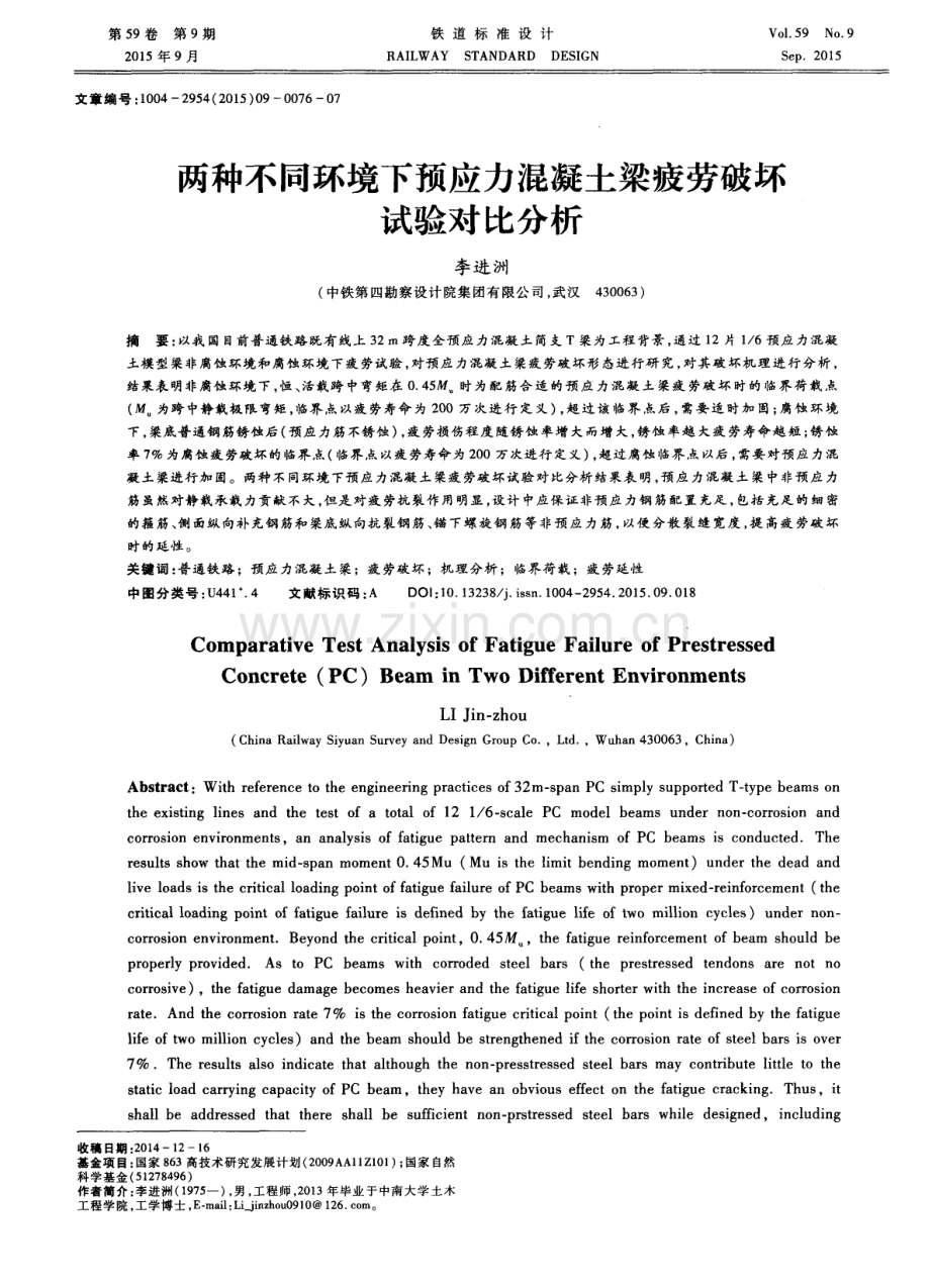 第 5 9卷第 9期 2 0 1 5年 9月 铁 道 标 准 设 计 RAI LWAY S TANDARD DESI GN V0 1 5 9 No 9 S e p201 5 文章编号 : 1 0 0 4 2 9 5 4 ( 2 0 1 5 ) 0 9 0 0 7 60 7 两种不同环境下预应力混凝土梁疲劳破坏 试验对比分析 李进 洲 ( 中铁第 四勘察设计院集团有限公司 , 武汉4 3 0 0 6 3 ) 摘 要 : 以我 国 目前普通铁路 既有线上 3 2 m跨度全预应 力混凝土 简支 T梁为工程背景 , 通过 1 2片 1 6预应 力混凝 土模 型梁非腐蚀环境和腐蚀环境 下疲 劳试验 , 对预应 力混凝 土梁疲 劳破坏形 态进行研 究 , 对其破 坏机理进行 分析 , 结果表明非腐蚀环境 下, 恒、 活栽跨 中弯矩在 0 4 5 M 时为 配筋合 适的预 应力混凝 土 梁疲 劳破 坏时 的临界荷 栽点 ( M 为跨 中静载极限弯矩 , 临界 点以疲 劳寿命为 2 0 0万次进 行定 义) , 超过 该临界 点后 , 需要 适时加 固; 腐蚀环 境 下 , 梁底普通钢 筋锈蚀后 ( 预应 力筋不锈蚀 ) , 疲劳损伤程度 随锈蚀 率增大 而增 大, 锈蚀 率越 大疲 劳寿命越 短 ; 锈蚀 率 7 为腐蚀疲 劳破坏的临界点( 临界点 以疲 劳寿命为 2 0 0万次进行定义) , 超过 腐蚀 临界 点以后 , 需要对预应力混 凝土梁进行加固。两种 不同环境 下预应 力混凝 土梁疲 劳破坏试验对比分析结果表 明, 预 应力混凝 土梁 中非预应 力 筋 虽然对静栽承载力贡献不天 , 但是对疲劳抗裂作用明显 , 设计 中应保证非预应 力钢 筋配置充足 , 包括充足 的细密 的箍筋、 侧 面纵 向补充钢筋和 梁底纵向抗裂钢筋、 锚 下螺旋钢 筋等非预 应力筋 , 以便 分散 裂缝 宽度 , 提 高疲 劳破 坏 时的 延 性 。 关键词 : 普通铁路 ;预应力混凝土梁 ;疲劳破 坏 ;机理分析 ;临界荷载 ;疲 劳延性 中图分类号 : U 4 4 1 4 文献标识码 : A D Ol : 1 0 1 3 2 3 8 j i s s n 1 0 0 4 2 9 5 4 2 0 1 5 0 9 O 1 8 Co m p a r a t i v e Te s t Ana l y s i s o f Fa t i g u e Fa i l u r e o f Pr e s t r e s s e d C o n c r e t e( P C)B e a m i n T w o Di ffe r e n t E n v i r o n me n t s L I J i n z h o u ( C h i n a Ra i l w a y S i y a a n S u r v e y a n d De s i g n Gr o u p C o ,L t d ,Wu h a n 4 3 0 0 6 3,C h i n a ) Ab s t r a c t :W i t h r e f e r e n c e t o t h e e n g i n e e r i n g p r a c t i c e s o f 3 2 m s pa n P C s i mp l y s up p o r t e d T t y p e b e a ms o n t h e e x i s t i n g l i n e s a n d t h e t e s t o f a t o t a l o f 1 2 1 6一 s c a l e PC mo d e l b e a ms u n d e r n o n - c o r r o s i o n a n d c o rro s i o n e n v i r o n me n t s,a n a n a l y s i s o f f a t i g u e pa t t e r n a n d me c h a n i s m o f PC b e a ms i s c o n d u c t e d Th e r e s u l t s s h o w t h a t t h e m i d s p a n m o me n t 0 4 5 M u( Mu i s t h e l i m i t b e n d i n g mo m e n t )u n d e r t h e d e a d a n d l i v e l o a d s i s t h e c r i t i c a l l o a d i n g p o i n t o f f a t i g u e f a i l u r e o f P C b e a ms wi t h p r o p e r mi x e d r e i n f o r c e me n t( t h e c r i t i c a l l o a d i n g p o i n t o f f a t i g u e f a i l u r e i s d e fi n e d b y t h e f a t i g u e l i f e o f t wo mi l l i o n c y c l e s )u n d e r n o n c o rro s i o n e n v i r o n me n t Be y o n d t h e c r i t i c a l p o i n t ,0 4 5 M ,t h e f a t i g u e r e i n f o r c e me n t o f b e a m s h o u l d b e p r o p e r l y p r o v i d e d A s t o P C b e a ms w i t h c o r r o d e d s t e e l b a r s ( t h e p r e s t r e s s e d t e n d o n s a r e n o t n o c o r r o s i v e ) ,t h e f a t i g u e d a ma g e b e c o m e s h e a v i e r a n d t h e f a t i g u e l i f e s h o r t e r w i t h t h e i n c r e a s e o f c o rr o s i o n r a t eAn d t he c o r r o s i o n r a t e 7i s t h e c o r r o s i o n f a t i g ue c r i t i c a l p o i n t f t h e p o i n t i s d e f i ne d b y t h e f a t i g u e l i f e o f t w o m i l l i o n c y c l e s )a n d t h e b e a m s h o u l d b e s t r e n g t h e n e d i f t h e c o r r o s i o n r a t e o f s t e e l b a r s i s o v e r 7 T he r e s u l t s a l s o i n d i c a t e t h a t a l t h o ug h t h e n o n p r e s s t r e s s e d s t e e l b a r s ma y c o n t r i b u t e l i t t l e t o t h e s t a t i c l o a d c a r r y i n g c a p a c i t y o f P C be a m ,t h e y ha v e a n o b v i o u s e f f e c t o n t h e f a t i g u e c r a c k i n g Th u s,i t s ha l l b e a d d r e s s e d t h a t t he r e s h a l l be s u f f i c i e n t n o n p r s t r e s s e d s t e e l b a r s wh i l e d e s i g n e d, i n c l u di n g 收稿 日期 : 2 0 1 41 2 1 6 基金项 目: 国家 8 6 3高技术研究发展计划( 2 0 0 9 A A 1 1 Z 1 0 1 ); 国家 自然 科学基金( 5 1 2 7 8 4 9 6 ) 作者简介: 李进洲 ( 1 9 7 5 一 ) , 男 , 工程师 , 2 0 1 3年毕业 于中南大学土木 工程学院。 工学博士 , E - ma i l : L i _ j i n z h o u 0 9 1 0 1 2 6 C O B。 第 9期 李进 洲一 两种 不同环境 下预应力混凝土梁疲劳破坏试验对 比分析 7 7 s t i r r u p s,l o n g i t u di n a l r e i n f o r c e me n t a nd a n c h o r s p i r a l r e i n f o r c e me n t t o d i s p e r s e t h e c r a c k wi d t h a n d i mp r o v e t h e d u c t i l i t y i n c a s e o f f a t i g u e f a i l ur e Ke y w o r d s :C o n v e r s i o n a l r a i l w a y ;P r e s t r e s s e d c o n c r e t e ( P C) b e a m;F a t i g u e f a i l u r e ; M e c h a n i s m a n a l y s i s;Cr i t i c a l l o a d i ng;Fa t i g u e d u c t i l i t y 目前, 我 国京广、 京沪、 京哈 、 陇海等繁忙铁路干线 大 量开行 时 速 2 0 02 5 0 k m“ 和 谐 号 ” 动 车 组 , 在 列 车 速 度大 幅提 升 、 列 车密 度大 幅增加 的同时 , 已经 普遍 开 行 5 0 0 0 6 5 0 0 t 重载货物列车。这种客货共线运行 , 速 度 、 密 度 、 载重 三者 并 举 的运 输 组 织 模 式 成 为 世 界 铁路运输上的一项重大创举 。客运高速、 货 