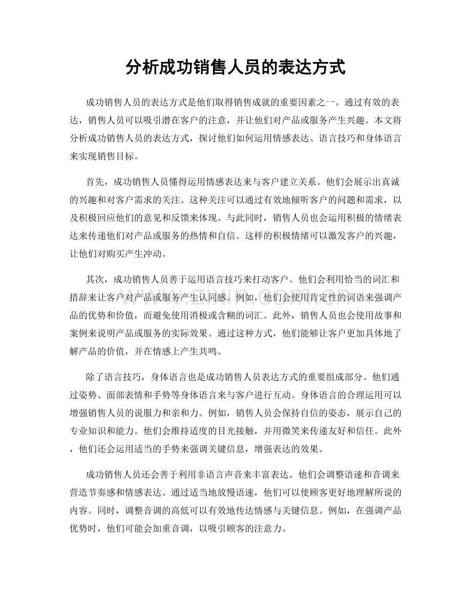 总之,成功销售人员的表达方式是他们取得销售成就的重要因素之一。他们善于运用情感表达、语言技巧和身体语言来与客户建立关系,并引发客户的兴趣和购买欲望。通过真诚的关注、积极的情绪表达、恰当的词汇和措辞、合理运用身体语言和非语言声音,成功销售人员能够有效地沟通和协调客户关系,实现销售目标。这些表达方式的运用可以提高销售人员的专业形象和说服力,为公司带来更多的销售机会和业绩增长。