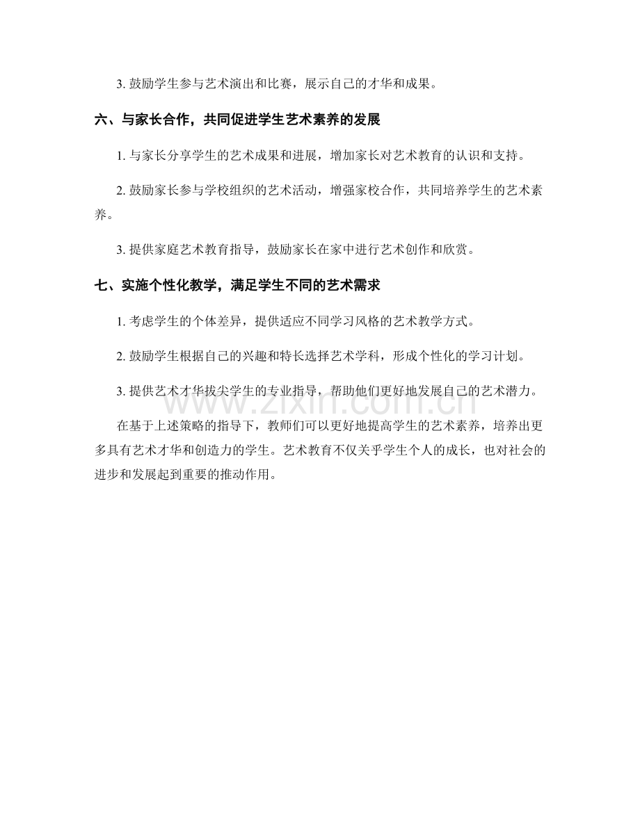 在基于上述策略的指导下,教师们可以更好地提高学生的艺术素养,培养出更多具有艺术才华和创造力的学生。艺术教育不仅关乎学生个人的成长,也对社会的进步和发展起到重要的推动作用。
