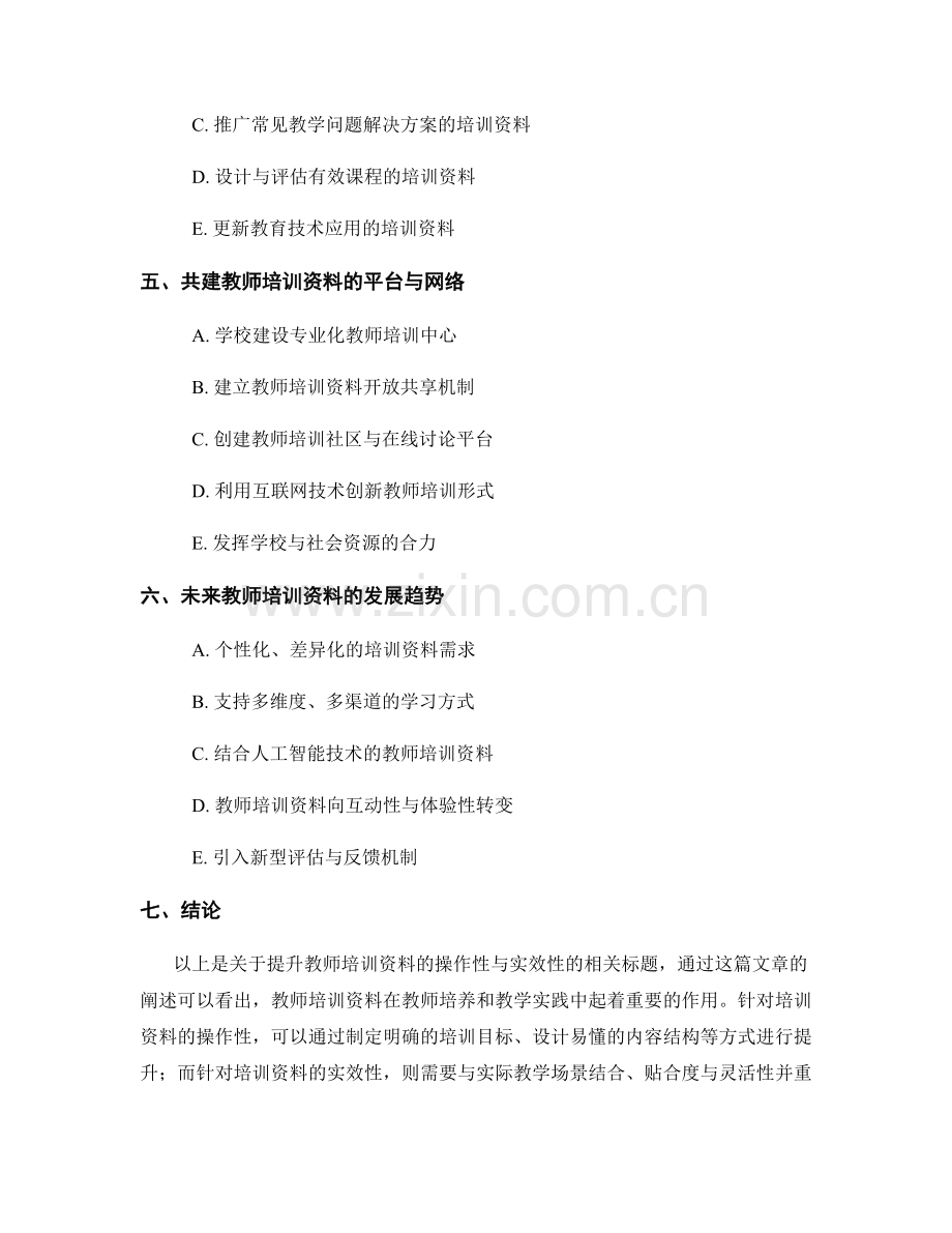 以上是关于提升教师培训资料的操作性与实效性的相关标题,通过这篇文章的阐述可以看出,教师培训资料在教师培养和教学实践中起着重要的作用。针对培训资料的操作性,可以通过制定明确的培训目标、设计易懂的内容结构等方式进行提升;而针对培训资料的实效性,则需要与实际教学场景结合、贴合度与灵活性并重等方面进行改进。最后,通过共建教师培训资料的平台与网络,以及关注未来教师培训资料的发展趋势,可以进一步提升培训资料的操作性与实效性,促进教师专业发展和教育质量提升。