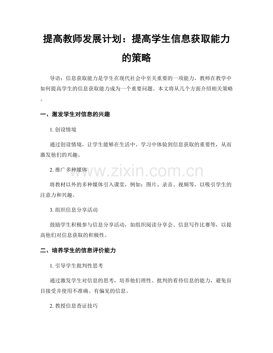 通过以上策略的引导和实施,教师可以提高学生的信息获取能力,从而更好地促进他们的全面发展。教师发展计划要将提高学生信息获取能力作为一个重要目标,并提供相应的支持和培训,以确保教师能够有效地实施相关策略,帮助学生提升信息获取能力。