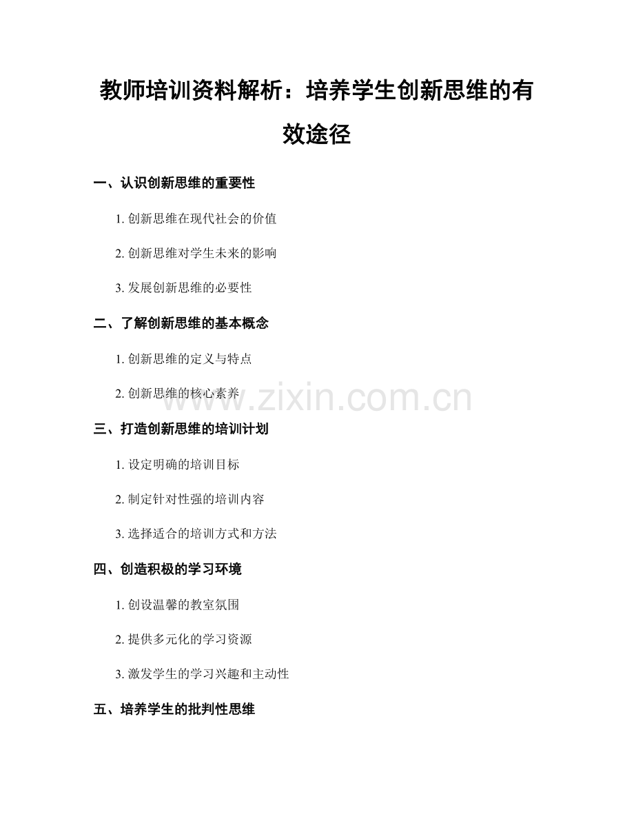 以上是一份关于教师培训资料解析:培养学生创新思维的有效途径的相关标题,通过这些标题我们可以深入阐述培养学生创新思维的重要性、创新思维的基本概念、培养计划与学习环境、批判性思维与团队合作等方面的有效途径。同时,提及了如何激发学生的想象力和创造力以及评估学生创新思维的有效性等具体措施。最后结合教师培训资料的价值和运用来给出一些建议和展望,指引教师们在培养学生创新思维方面进行有针对性的工作。