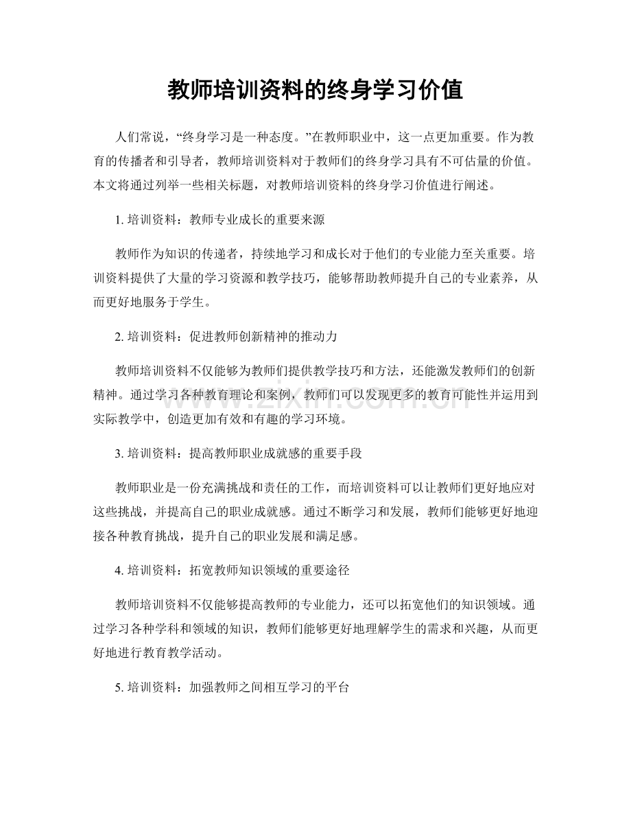 综上所述,教师培训资料对于教师们的终身学习具有不可估量的价值。它不仅可以提供专业知识和教学技巧,促进教师的成长和创新,还可以拓宽教师的知识领域,加强教师之间的相互学习和合作。通过培养教师的自主学习能力和习惯,提升对教育改革的理解和应对能力,教师培训资料为教师们在职业生涯中发展和进步提供了重要的支持和帮助。因此,教师们应该充分利用培训资料,实现终身学习的价值。