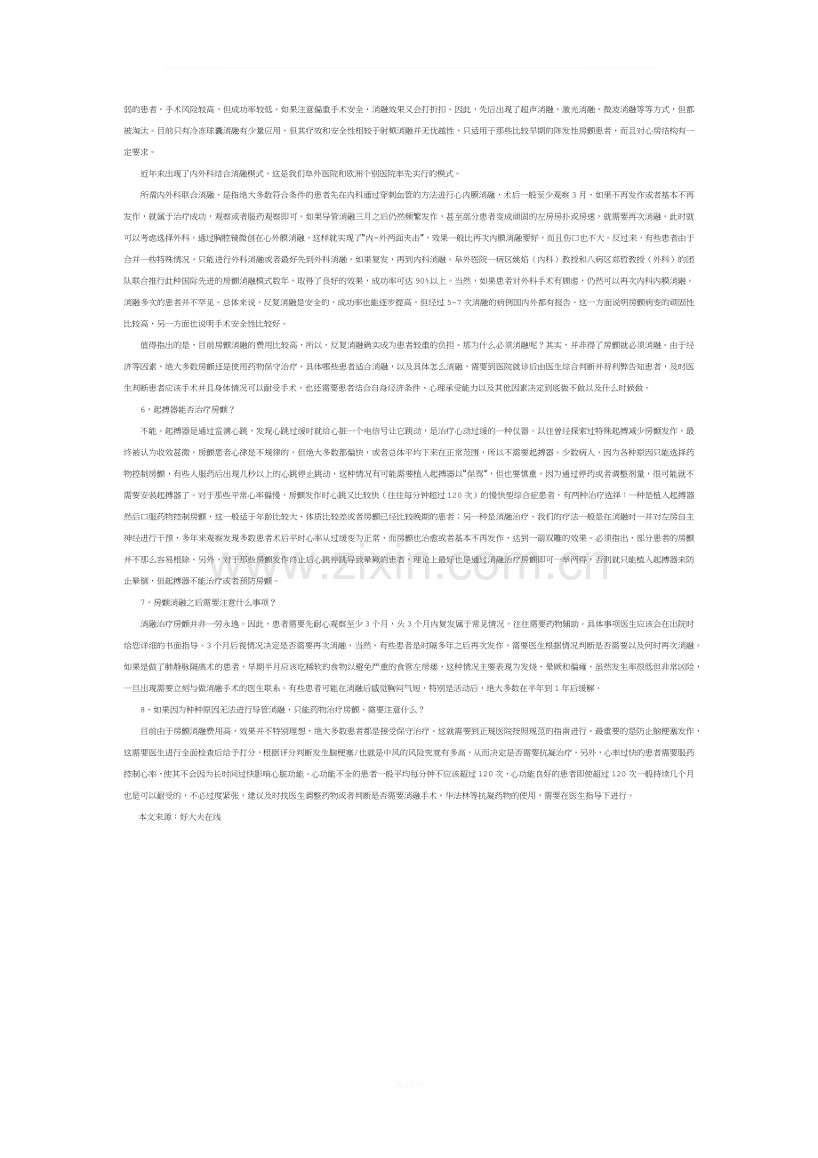 消融治疗房颤并非一劳永逸。因此,患者需要先耐心观察至少3个月,头3个月内复发属于常见情况,往往需要药物辅助。具体事项医生应该会在出院时给您详细的书面指导。3个月后视情况决定是否需要再次消融。当然,有些患者是时隔多年之后再次发作,需要医生根据情况判断是否需要以及何时再次消融。如果是做了肺静脉隔离术的患者,早期半月应该吃稀软的食物以避免严重的食管左房瘘,这种情况主要表现为发烧、晕厥和偏瘫,虽然发生率很低但非常凶险,一旦出现需要立刻与做消融手术的医生联系。有些患者可能在消融后感觉胸闷气短,特别是活动后,绝大多数在半年到1年后缓解。
