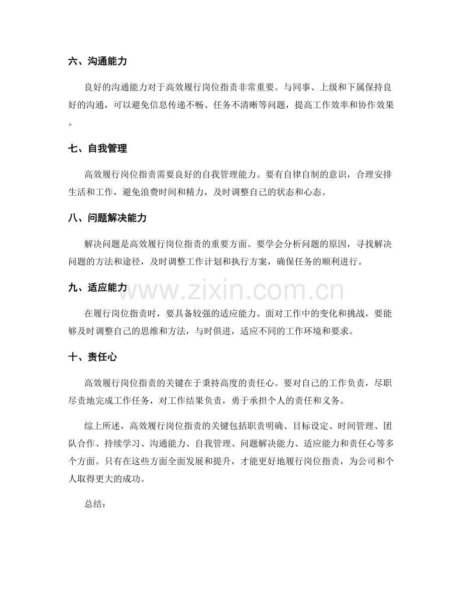 综上所述,高效履行岗位指责的关键包括职责明确、目标设定、时间管理、团队合作、持续学习、沟通能力、自我管理、问题解决能力、适应能力和责任心等多个方面。只有在这些方面全面发展和提升,才能更好地履行岗位指责,为公司和个人取得更大的成功。