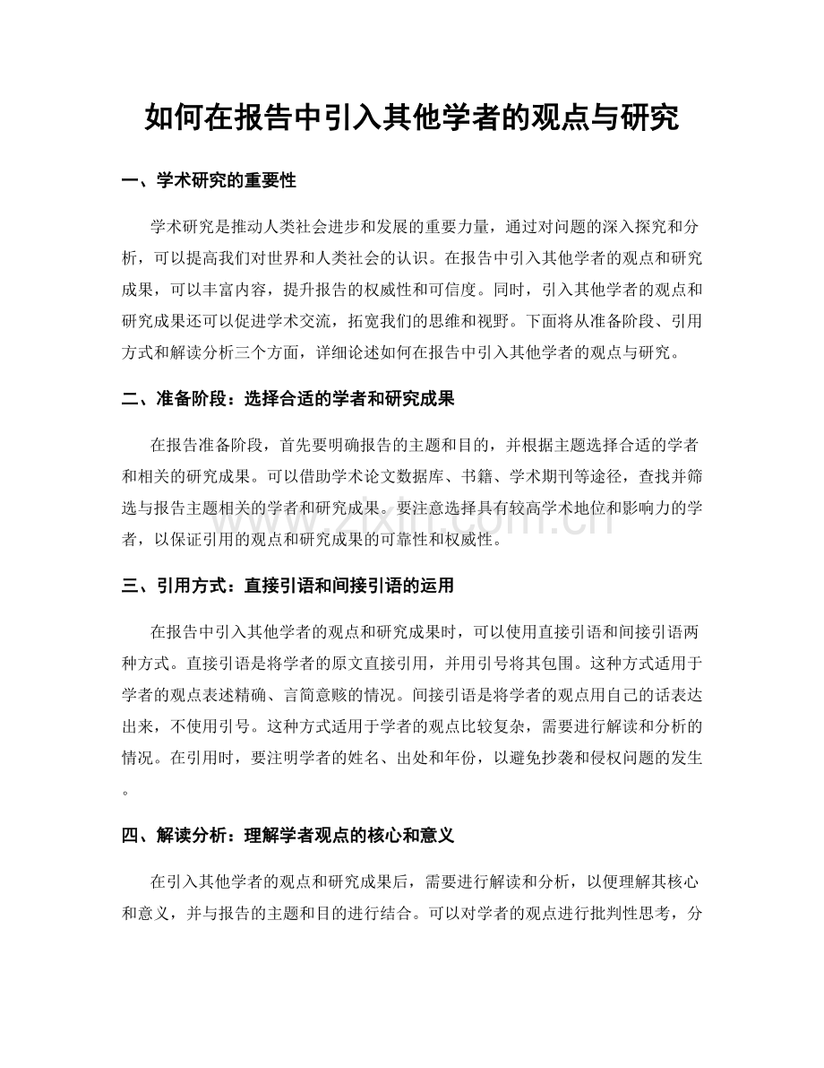 在引入其他学者的观点和研究成果后,需要进行解读和分析,以便理解其核心和意义,并与报告的主题和目的进行结合。可以对学者的观点进行批判性思考,分析其优缺点,提出自己的见解或观点。此外,还可以结合其他学者的观点和研究成果进行对比和综合,形成多元的视角和观点。