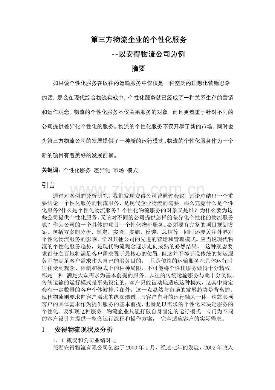 通过对案例的分析研究,我们发现安得公司曾通过会议,讨论总结出一个重要结论--个性化服务的物流服务,是现代企业物流的需要。那么究竟什么是个性化服务?什么是个性化物流服务?个性化物流服务的对象又是谁?为什么要为这些公司提供个性化服务,又该对不同的公司提供怎样的差异化个性化的物流服务呢?作为公司的一个具体的项目--个性化物流服务。必须要有完整的项目规划方案,包括方案的分析,制定,实验,实施,反馈,总结等。同时还要关注外界对个性化物流服务的影响,学习其他公司的先进的营运和管理模式。应当说现代物流的个性化服务趋势,是现代物流观念逐步走向成熟的必然结果。 这种观念要求百分之百地将满足客户需求置于最核心的位置,但这并不等于说传统的货运服务不把满足客户需求作为自己的服务目的, 只是传统的运输服务在具体运行时往往受到观念、体制和模式上的种种局限,不可能将个性化服务做得十分精致。那是一种 满足大众需求为基本前提的服务。以往的传统运输服务与此十分类似。传统运输的运行模式是事先设定的,客户只能被动地适应这种模式,这其中肯定会有一定数量的客户个体被排斥在外,这一点显然与市场的发展趋势是背离的。现代物流则要求向客户需求的纵深渗透,与客户自身的运行融为一体,这就必须 客户的具体需求作为提供服务的基本前提,也就是以需求的个性化来决定服务的个性化。要实现这种服务.物流企业只能打破自身固定的运行模式.专门为不同的客户设计并提供一整套运行流程和操作方案, 完全适应客户的实际需求。
