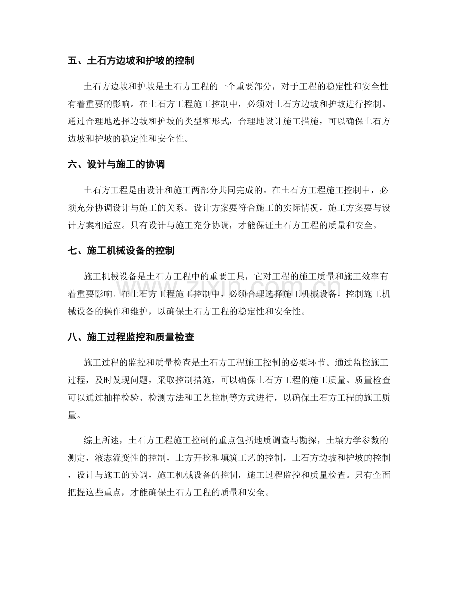 综上所述,土石方工程施工控制的重点包括地质调查与勘探,土壤力学参数的测定,液态流变性的控制,土方开挖和填筑工艺的控制,土石方边坡和护坡的控制,设计与施工的协调,施工机械设备的控制,施工过程监控和质量检查。只有全面把握这些重点,才能确保土石方工程的质量和安全。